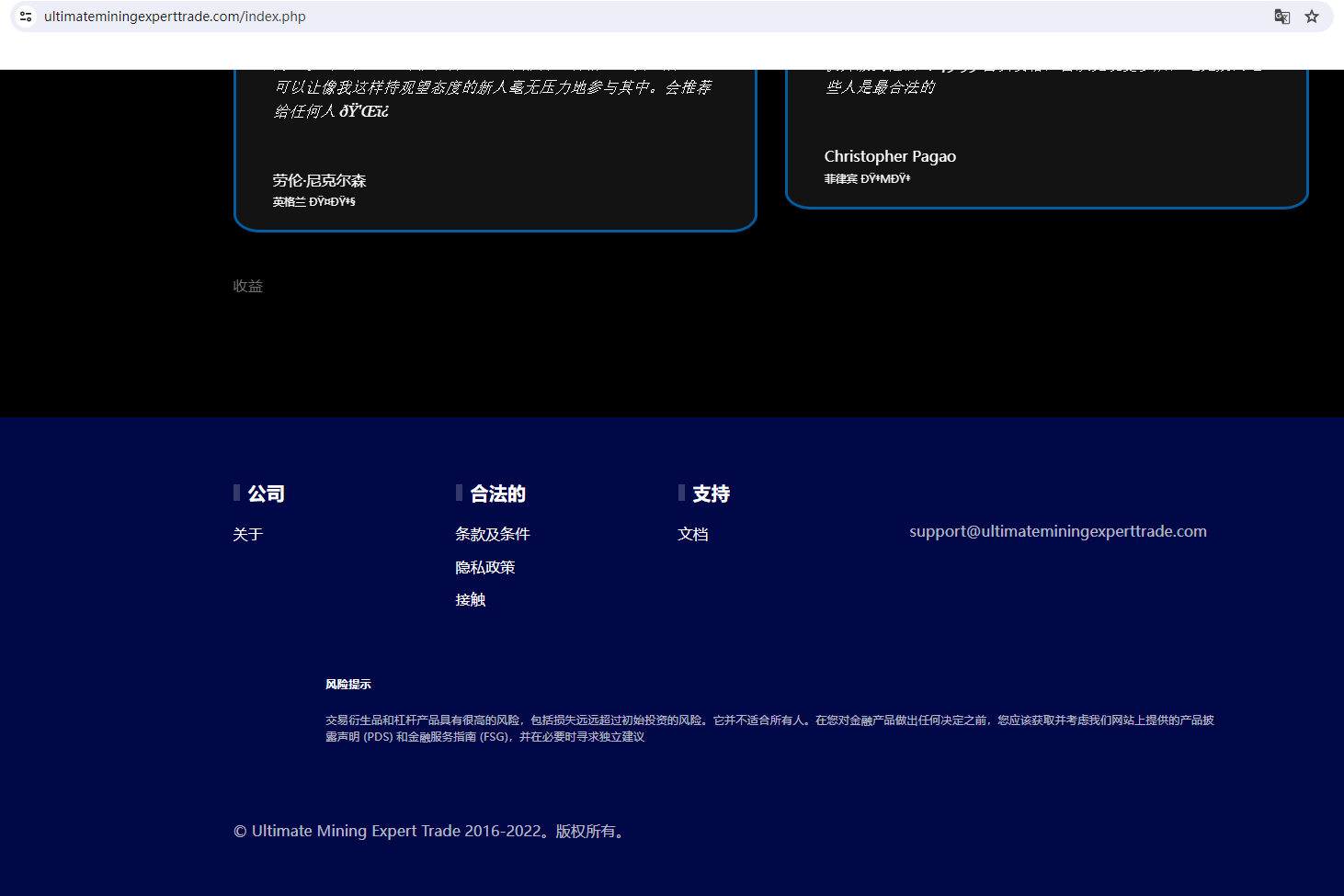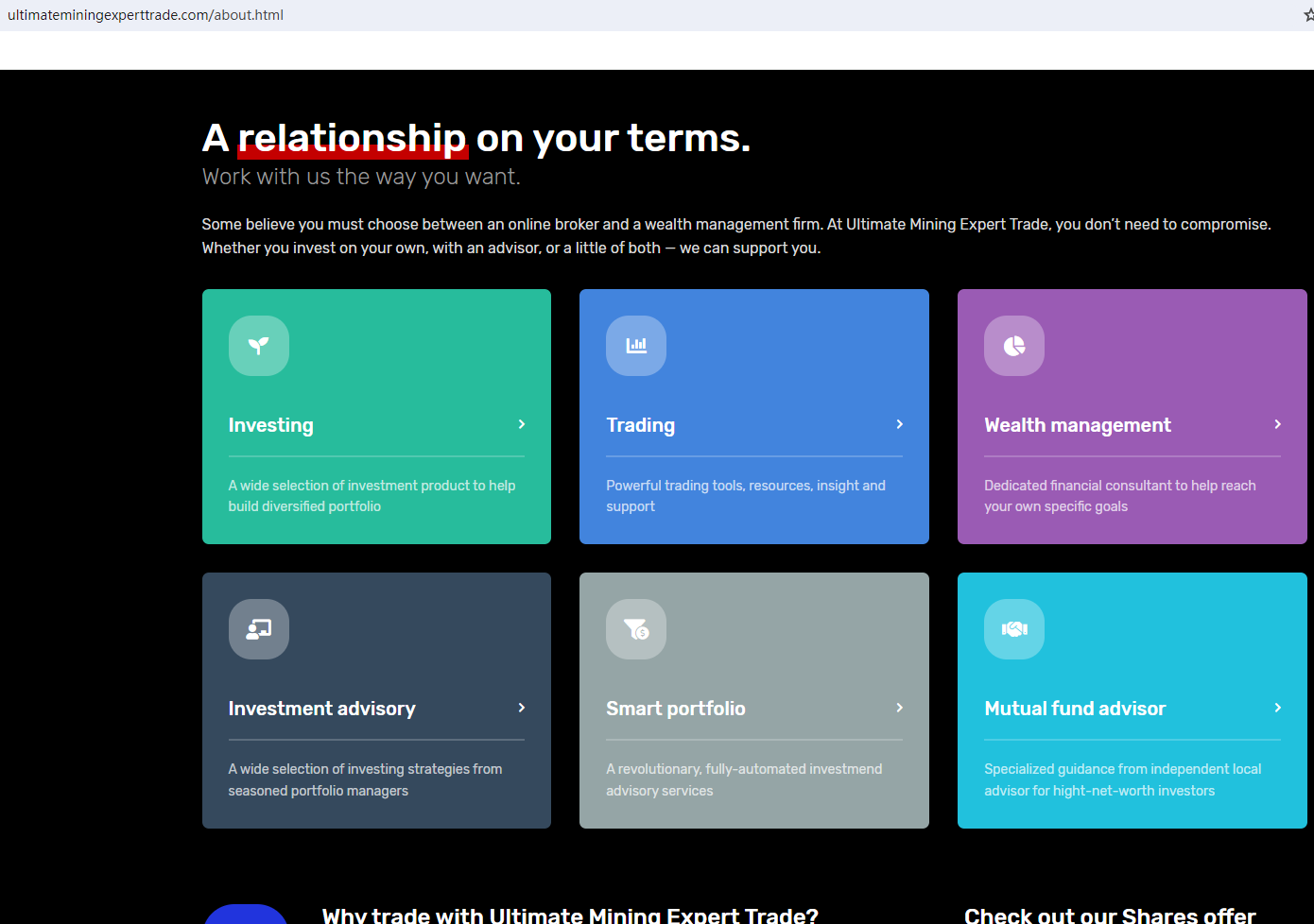 According to its website, we can find that this scam website uses a website template commonly used by fake traders. This template comes with fixed content and icon design. Scam websites often exhibit certain common traits. They typically have short lifespans, disappearing as soon as their fraudulent activities are discovered, only to reappear under a different brand and web address. These sites are frequently hastily assembled, with fraudsters commonly utilizing basic forex broker website templates to facilitate their scams. They simply replace the existing brand name in the content with their own, often neglecting to ensure grammatical accuracy or logical consistency. Ultimate Mining Expert Trade is a prime example of such group scammers. It utilizes the same website template as REAL INVESTMENT LTD (https://www.brokersview.com/brokers/real-investment-ltd), a scam previously exposed by BrokersView.
