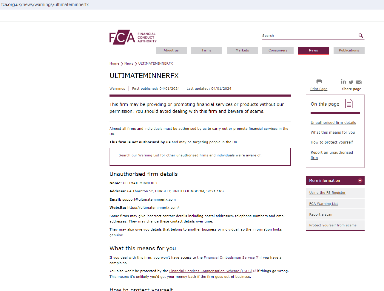 In addition, the United Kingdom Financial Conduct Authority (UK FCA) issued a warning that ULTIMATEMINNERFX was providing financial services or products in the UK without authorisation.