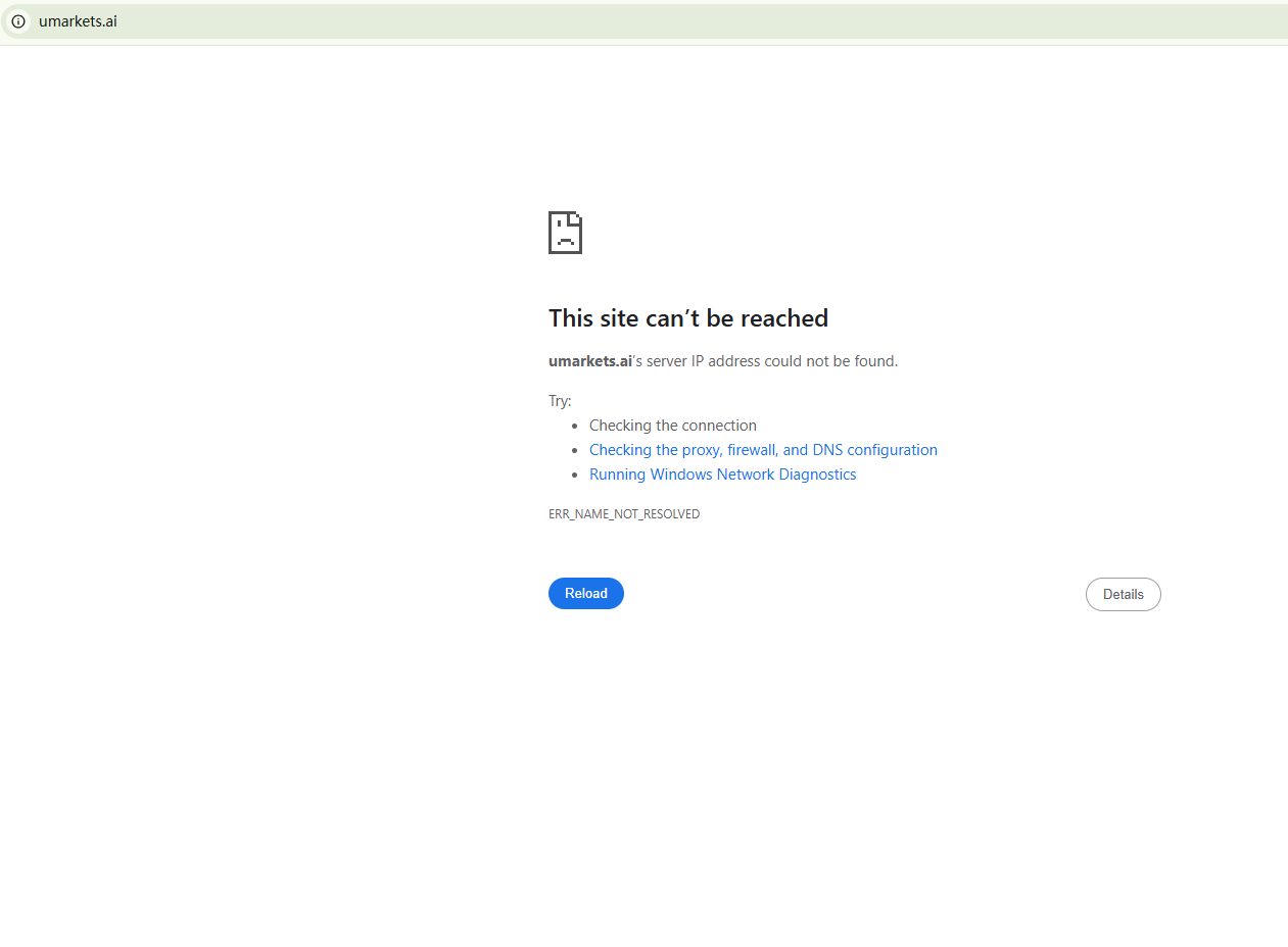 BrokersView found that the domain "https://umarkets.ai/" is currently inaccessible. This is widely regarded as a significant red flag, as the suspension of a broker's website often points to underlying regulatory or operational issues.