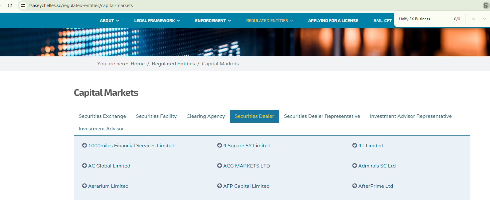 Unify FX Business claims to be licensed by the Cyprus Securities and Exchange Commission (CySEC) and Seychelles Financial Services Authority (Seychelles FSA). However, the CySEC has added Unify FX Business to its warning list, refuting its claim of being authorized by them. As for the Seychelles FSA authorization claim, there are no matching records from the authority to substantiate it.