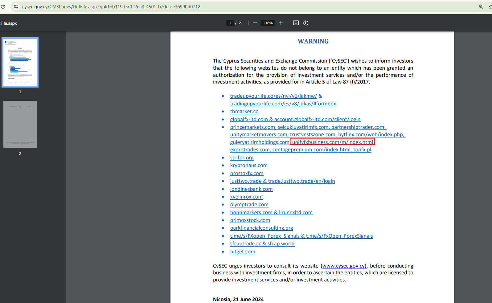 On June 21, 2024, the Cyprus Securities and Exchange Commission (CySEC) added Unify FX Business to its warning list, stating it does not belong to an entity which has been granted an authorization for the provision of investment services and/or the performance of investment activities. https://www.cysec.gov.cy/CMSPages/GetFile.aspx?guid=b119d5c1-2ea3-4501-b70e-ce36990d0712