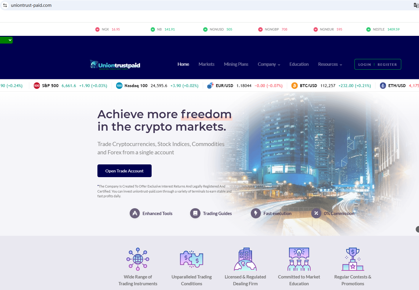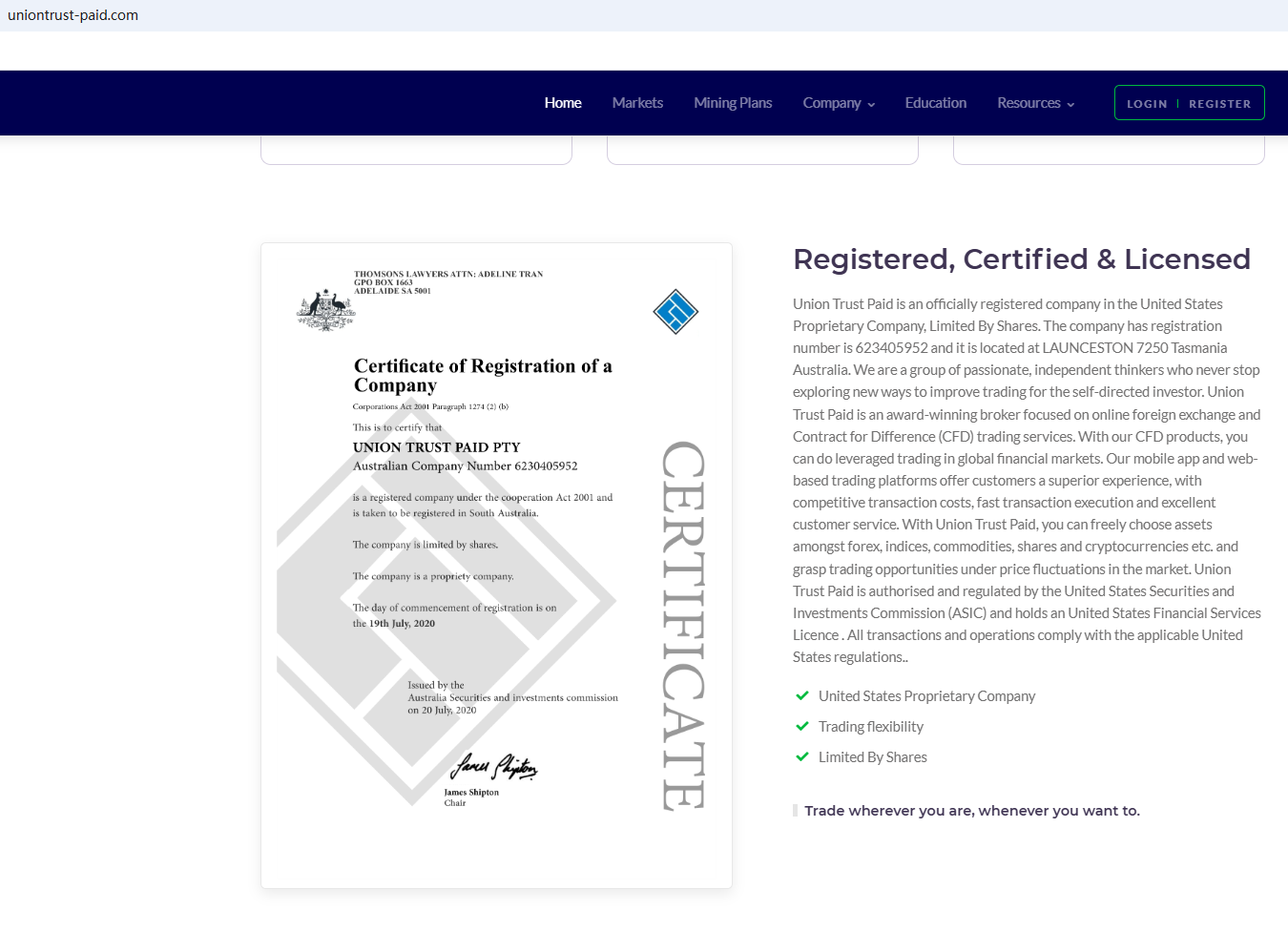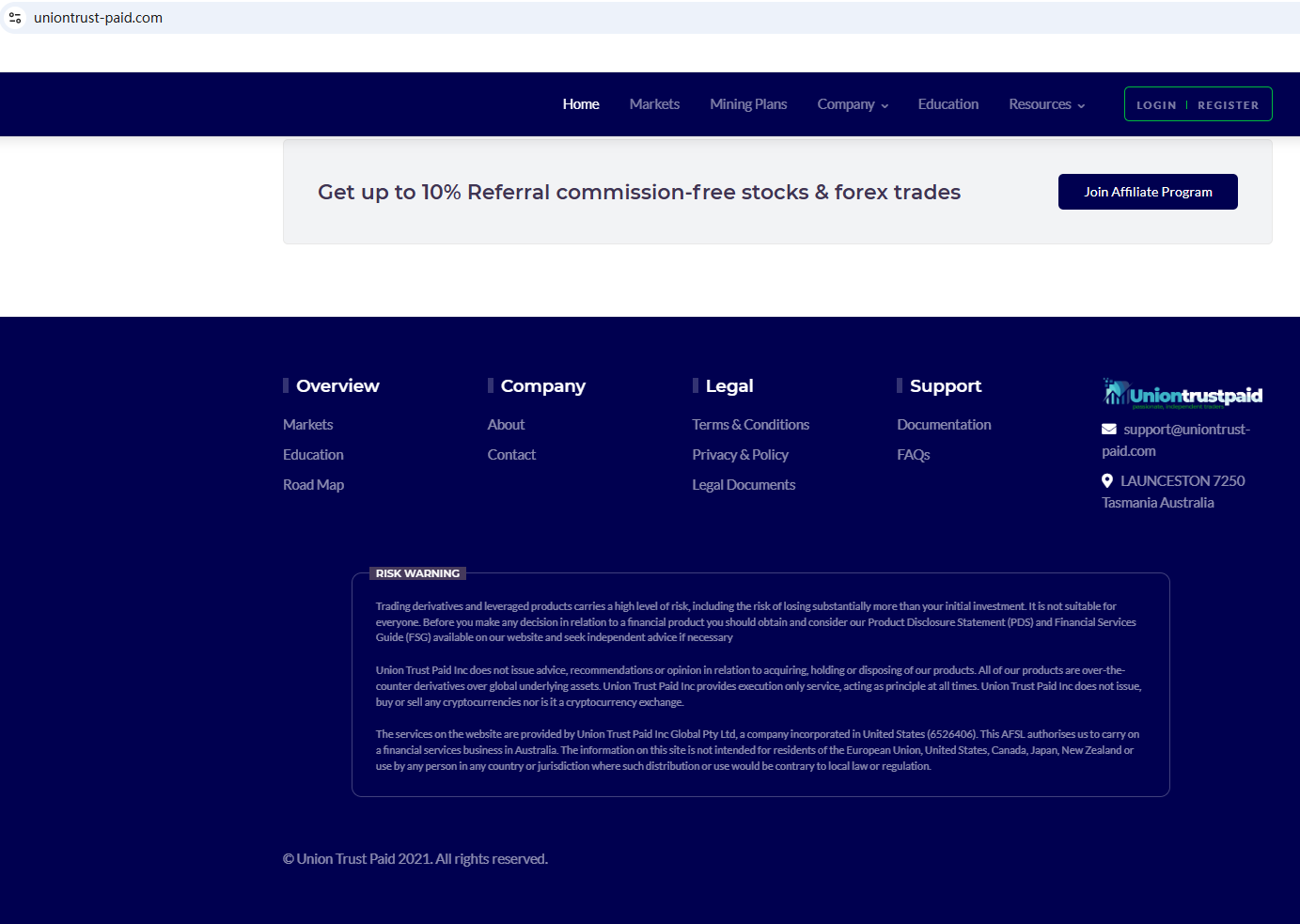 According to its website, it claims to be registered in both the US and Australia. However, after searching, we found no matching information with the National Futures Association (NFA). Furthermore, we discovered that the Australian Securities & Investments Commission (ASIC) issued a warning against Union Trust Paid, believing this company might be providing financial services or products without proper authorization.