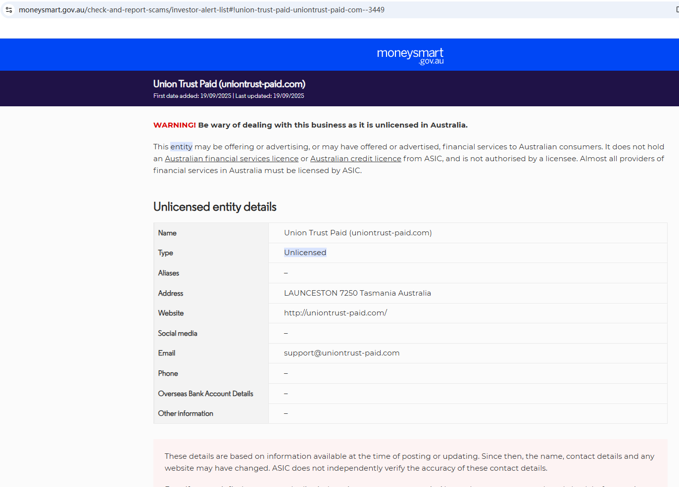 On Sept 19, 2025, the Australian Securities & Investments Commission (ASIC) issued a warning against Union Trust Paid, believing this company might be providing financial services or products without proper authorization. https://moneysmart.gov.au/check-and-report-scams/investor-alert-list#!union-trust-paid-uniontrust-paid-com--3449