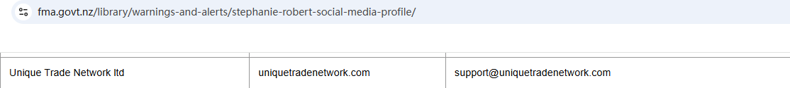 On May 5, 2025, the New Zealand Financial Markets Authority (NZ FMA) added Unique Trade Network ltd to its warning list, stating that this is a fake investment platform. https://www.fma.govt.nz/library/warnings-and-alerts/stephanie-robert-social-media-profile/