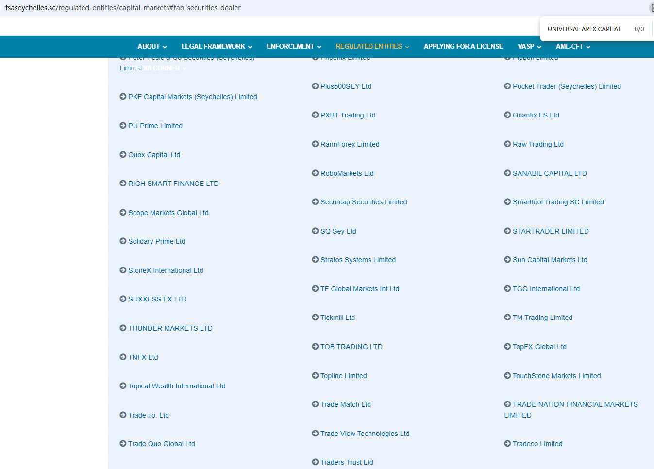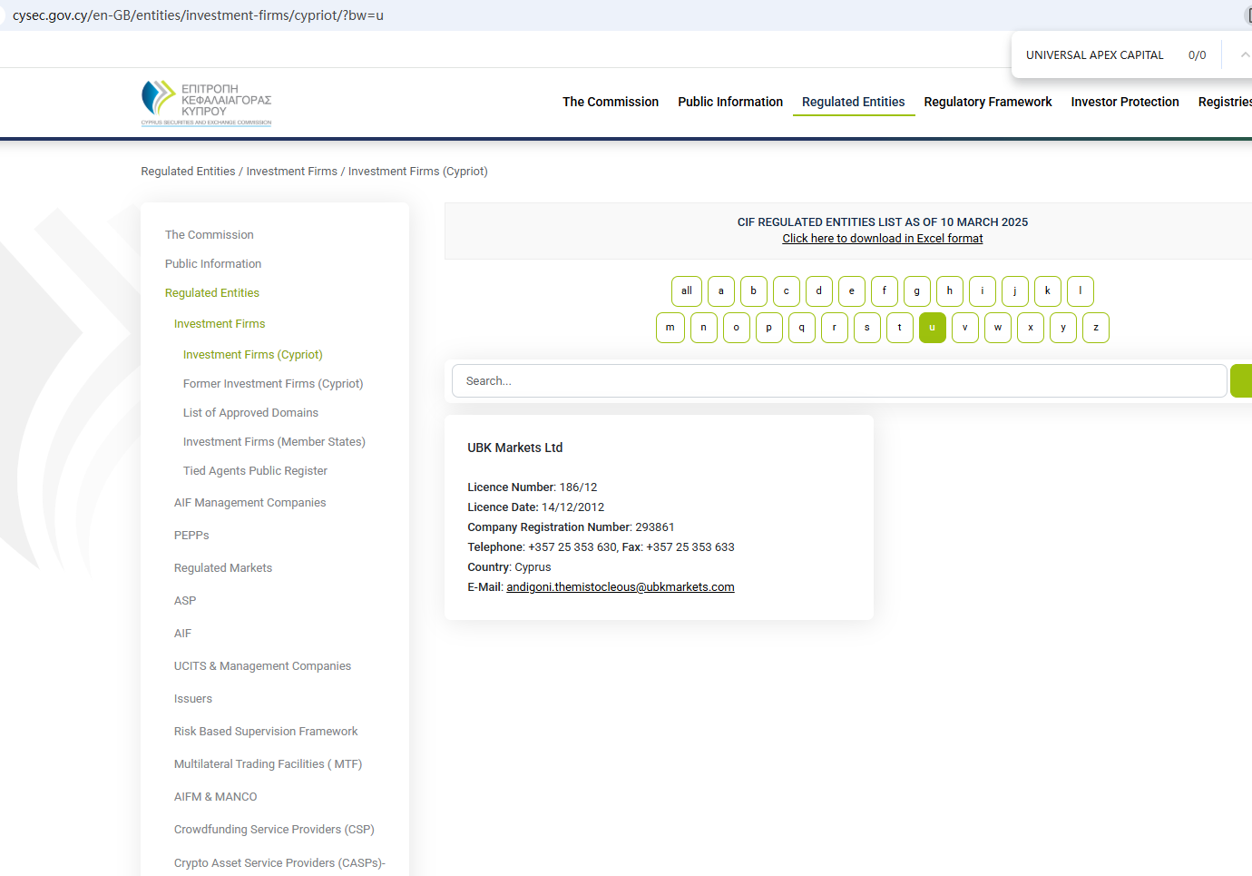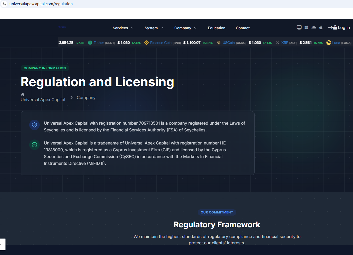 According to its website, it claims to be regulated by the Seychelles Financial Services Authority (Seychelles FSA) and the Cyprus Securities and Exchange Commission (CySEC). Upon investigation, no matching information was found in the Seychelles FSA and CySEC. In addition, the Financial Conduct Authority (FCA) issued a warning regarding UNIVERSAL APEX CAPITAL, suspecting that this company may be offering financial services or products without the necessary authorization.