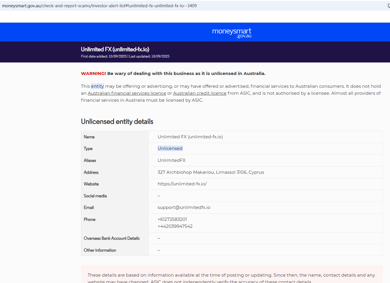 On Sept 10, 2025, the Australian Securities & Investments Commission (ASIC) issued a warning against UnlimitedFX, believing this company might be providing financial services or products without proper authorization. https://moneysmart.gov.au/check-and-report-scams/investor-alert-list#!unlimited-fx-unlimited-fx-io--3409