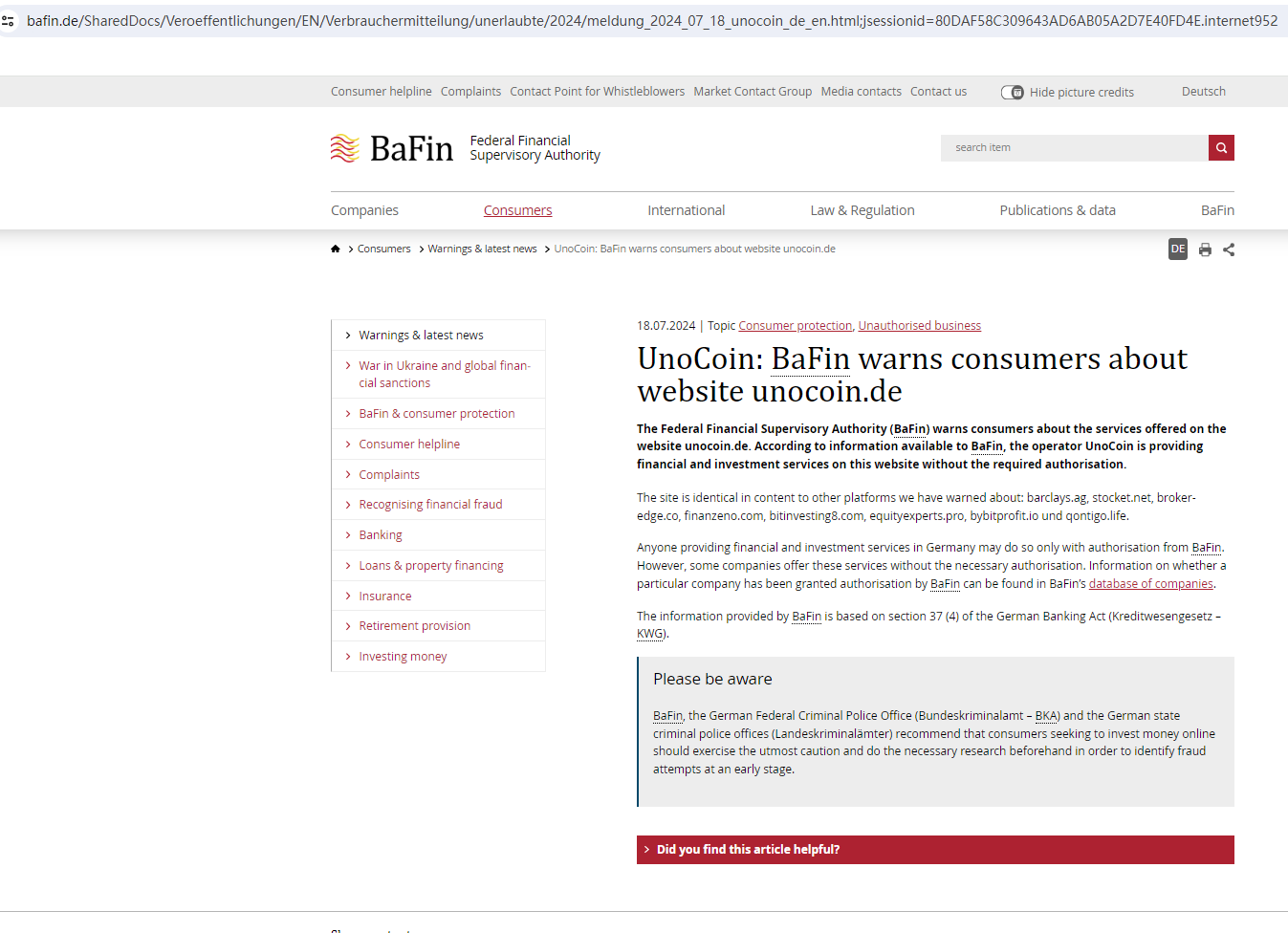 On July 18, 2024, the Federal Financial Supervisory Authority (BaFin) warned consumers about the services offered on the website unocoin.de for lacking the required authorization. https://www.bafin.de/SharedDocs/Veroeffentlichungen/EN/Verbrauchermitteilung/unerlaubte/2024/meldung_2024_07_18_unocoin_de_en.html;jsessionid=80DAF58C309643AD6AB05A2D7E40FD4E.internet952