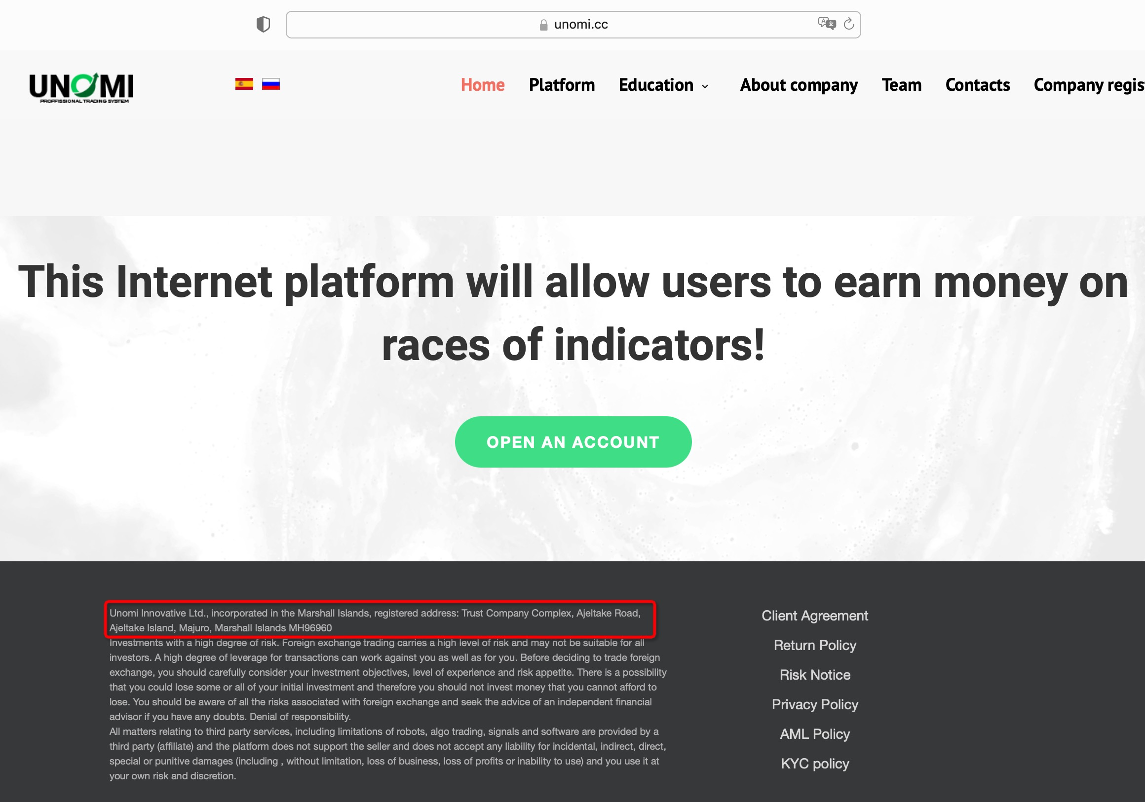 Unomi claims to be operated by Unomi Innovative Ltd, which is registered with the Marshall Islands Registry (IRI).