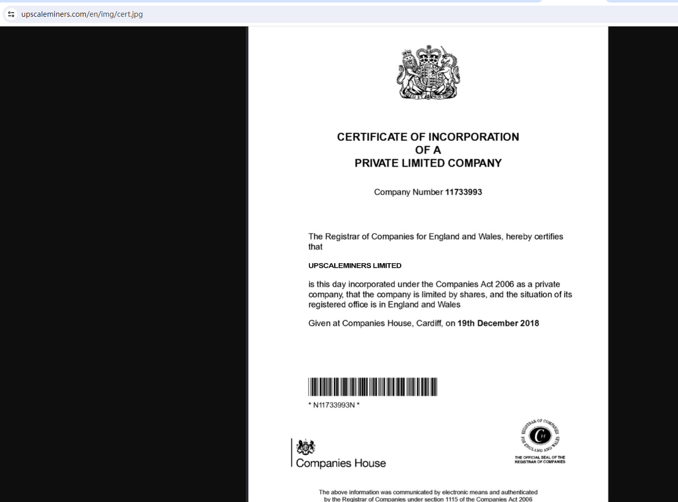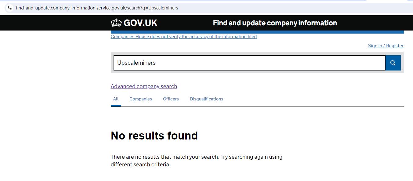 Upscaleminers claims to be registered under the UK Companies House (CH). We searched by the company number 11733993 but found a mismatch for one company BASE BITS LIMITED which had a different company name and registered office address than Upscaleminers, when we searched by company name Upscaleminers there were no results.