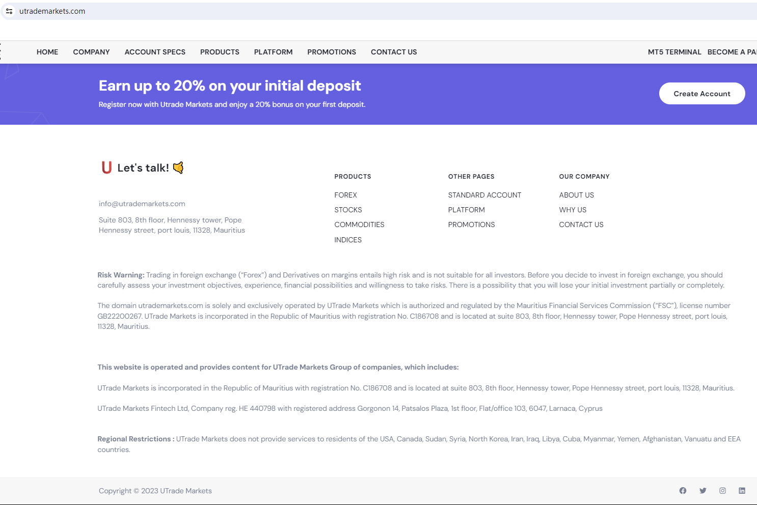 According to its website, it claims regulated by the Financial Services Commission, Mauritius (the 'FSC Mauritius') and the Cyprus Securities and Exchange Commission (CySEC). Upon investigation, no matching information was found in the FSC and CySEC.