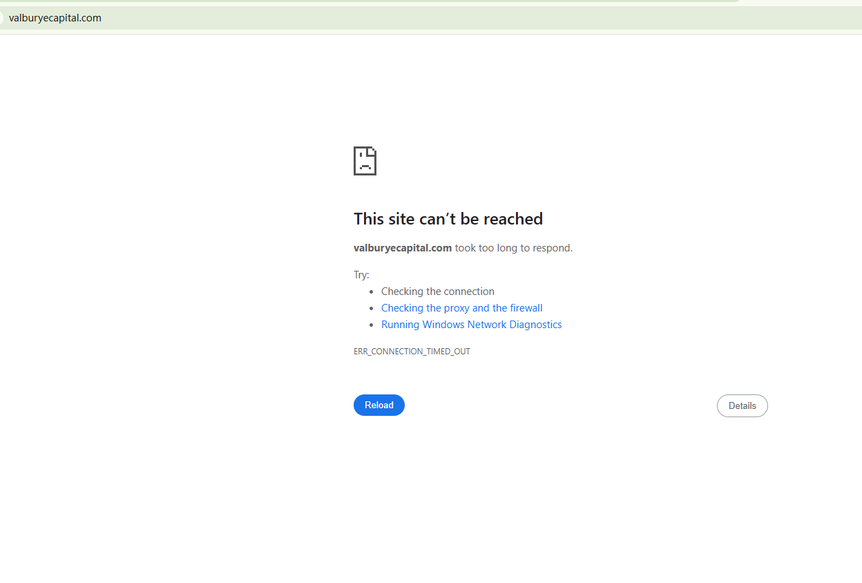 BrokersView found that the domain "https://valburyecapital.com/" is currently inaccessible. This is widely regarded as a significant red flag, as the suspension of a broker's website often points to underlying regulatory or operational issues.