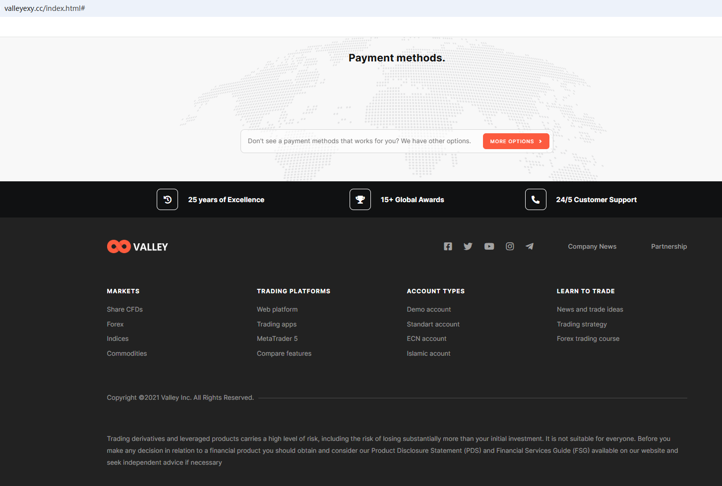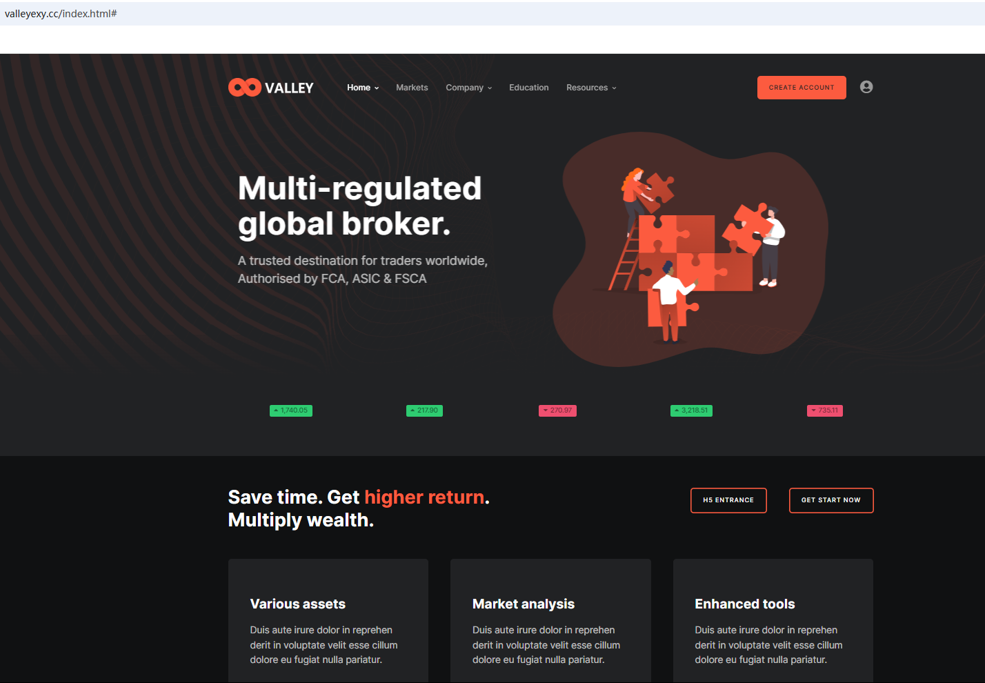 According to its website, it is to be regulated by the Financial Conduct Authority (FCA), the Financial Sector Conduct Authority (FSCA), and the Australian Securities and Investments Commission (ASIC). Upon investigation, no matching information was found in the FCA and FSCA. In addition, we found that the Australian Securities & Investments Commission (ASIC) issued a warning against Valley Exy, believing this company might be providing financial services or products without proper authorization.