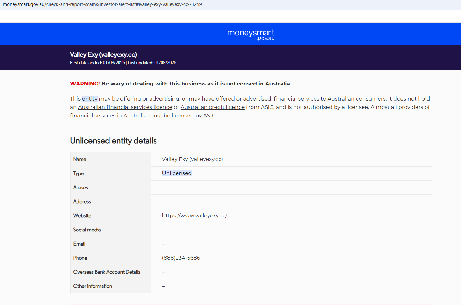 On Aug 1, 2025, the Australian Securities & Investments Commission (ASIC) issued a warning against Valley Exy, believing this company might be providing financial services or products without proper authorization. https://moneysmart.gov.au/check-and-report-scams/investor-alert-list#!valley-exy-valleyexy-cc--3259