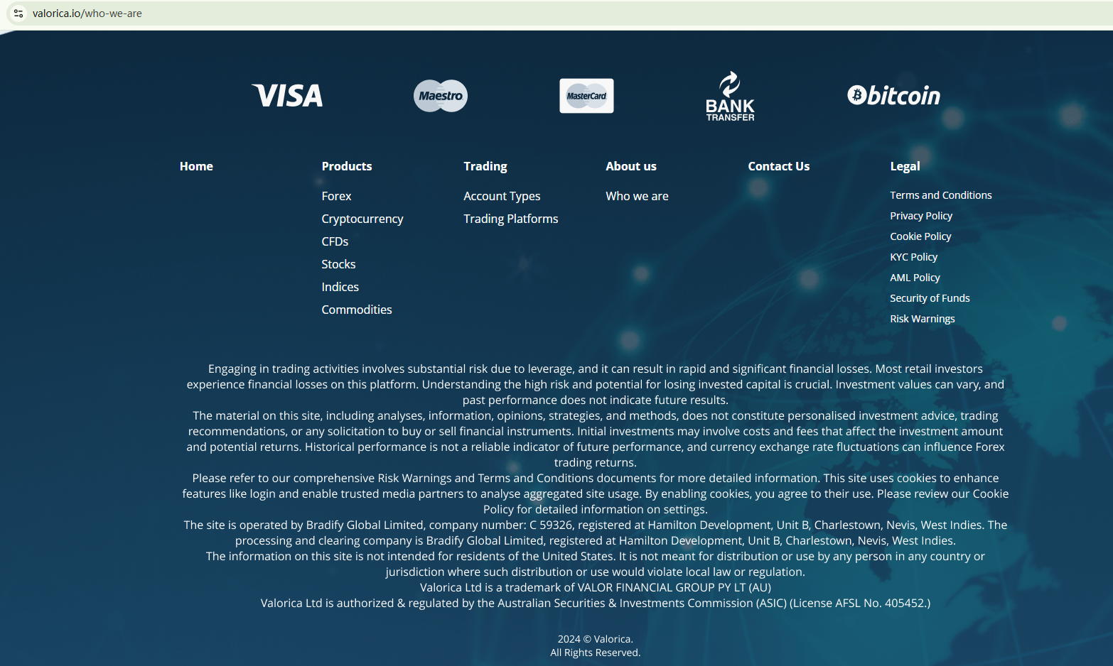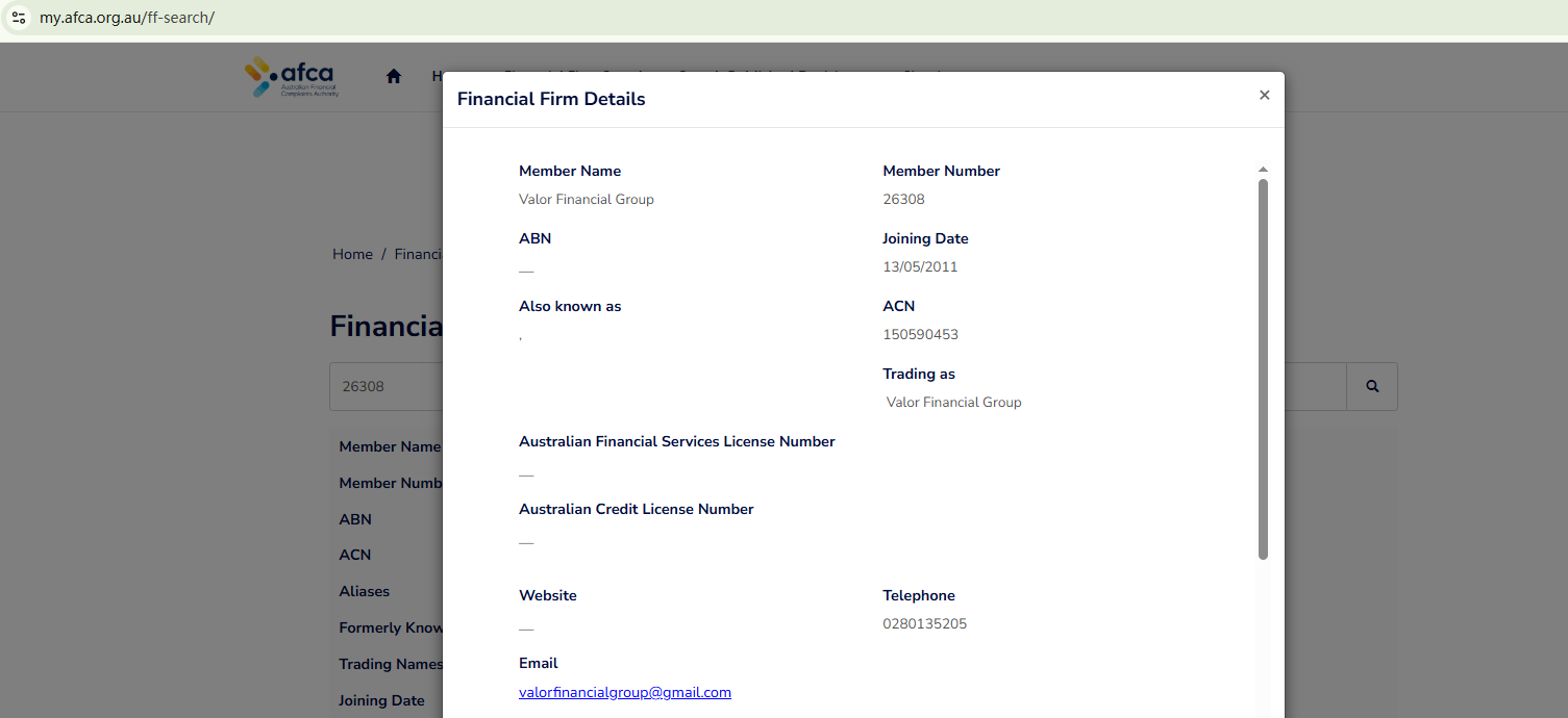 VALORICA claims to be operated by a company called VALOR FINANCIAL GROUP PTY LTD which is authorized by the Australian Securities and Investments Commission (ASIC). However, the information disclosed by the ASIC cannot support the claimed affiliation between VALORICA and VALOR FINANCIAL GROUP PTY LTD. We suspect that this trading platform is involved in a potential identity fraud. In addition, the Comisión Nacional del Mercado de Valores (CNMV) has added VALORICA to its warning list for providing investment services without authorization.