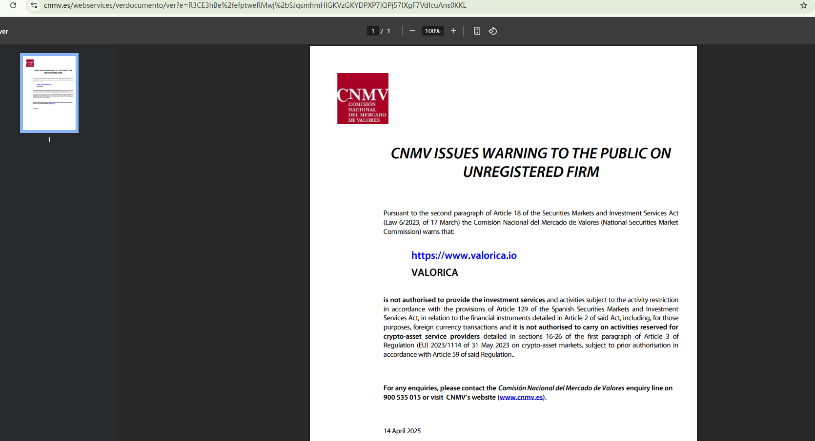 On April 14, 2025, the Comisión Nacional del Mercado de Valores (CNMV) has added VALORICA to its warning list for providing investment services without authorization. https://www.cnmv.es/Portal/ResultadoBusqueda?tipo=1&nombre=VALORICA