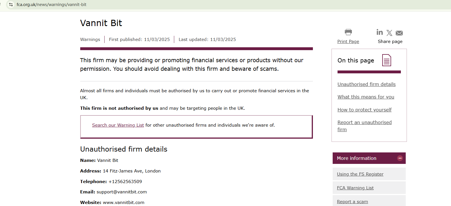 On March 11, 2025, the Financial Conduct Authority (FCA) issued a warning against Vannit Bit for the lack of the required authorization. https://www.fca.org.uk/news/warnings/vannit-bit