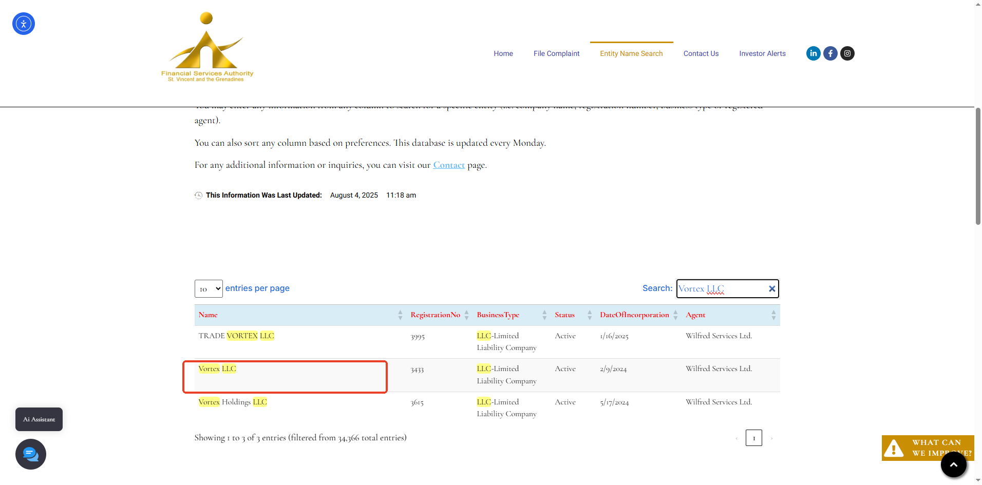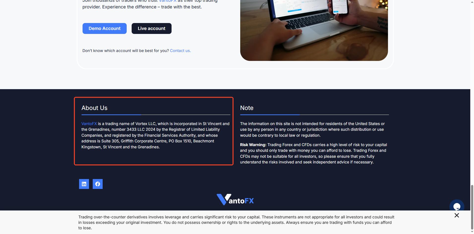 VantoFX claims to operate under Vortex LLC, which is registered with the Financial Services Authority (FSA) of Saint Vincent and the Grenadines. While we confirm that a matching company exists in the registry of SVG FSA, this only grants International Business Company (IBC) status. It does not constitute a valid financial license. The SVG FSA has clearly stated that it does not regulate or license forex brokers.
