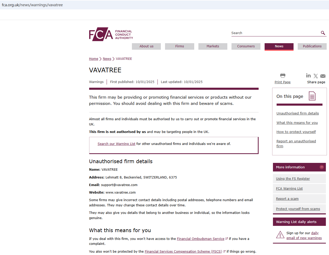 On January 10, 2025, the Financial Conduct Authority (FCA) issued a warning against VAVATREE, believing this company might be providing financial services or products without proper authorization in the UK. https://www.fca.org.uk/news/warnings/vavatree