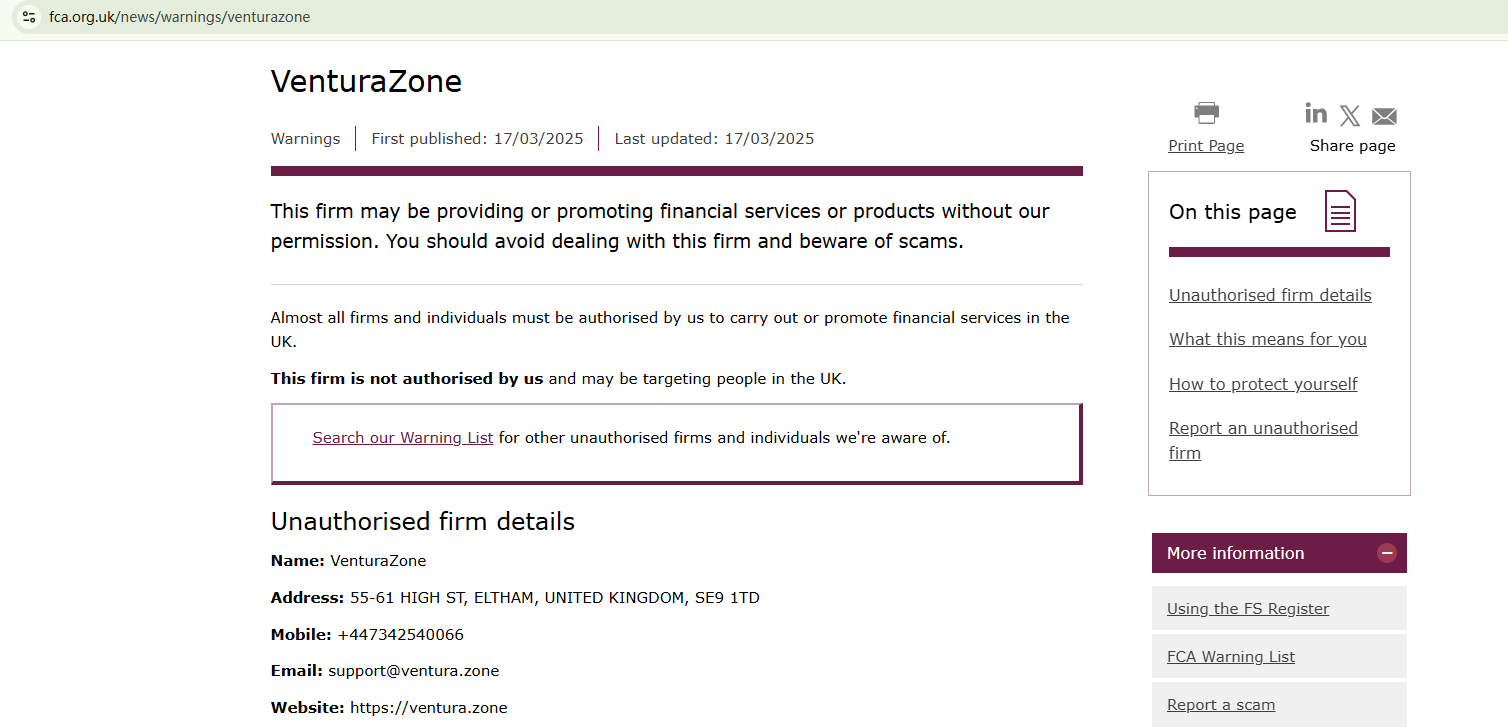 On March 17, 2025, the Financial Conduct Authority (FCA) issued a warning against VenturaZone for the lack of the required authorization. https://www.fca.org.uk/news/warnings/venturazone