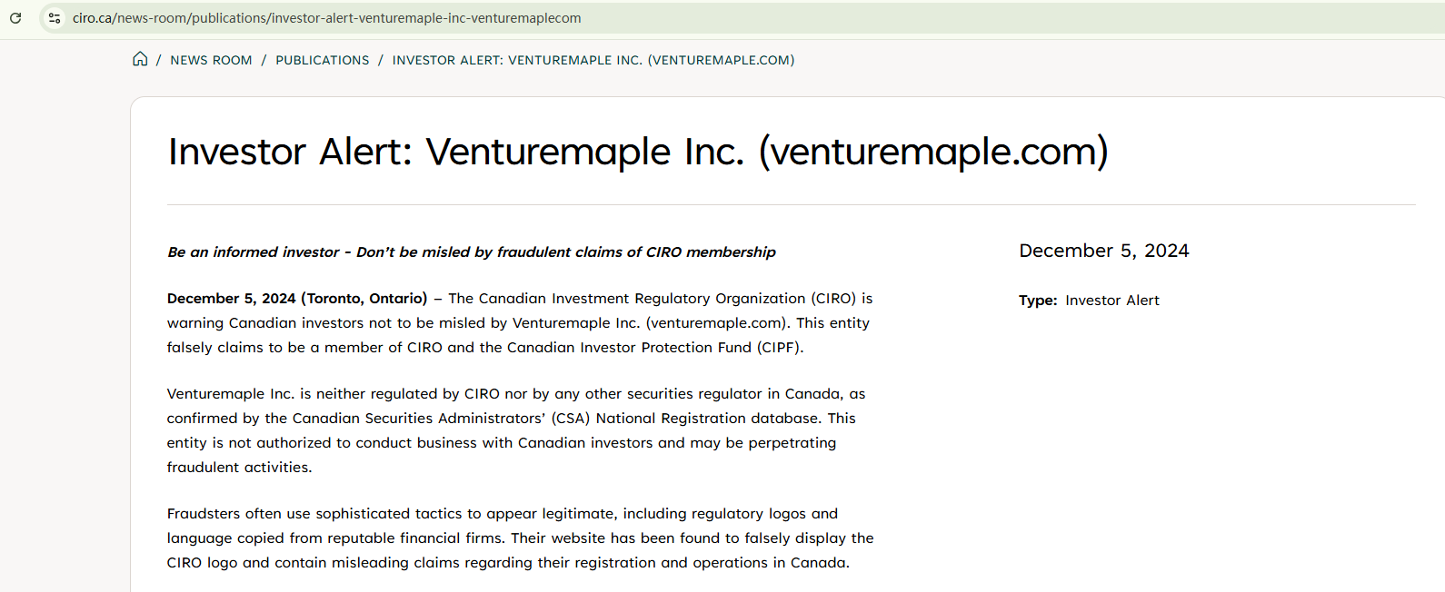 On December 5, 2024, the Investment Industry Regulatory Organization of Canada (IIROC) issued a warning against Venturemaple, stating that this broker falsely claims to be a member of CIRO and the Canadian Investor Protection Fund (CIPF). https://www.ciro.ca/news-room/publications/investor-alert-venturemaple-inc-venturemaplecom