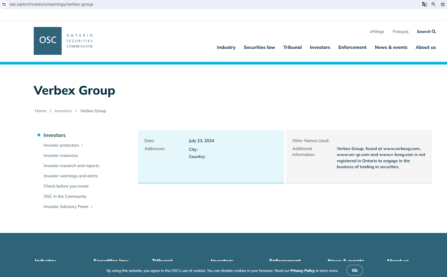 On July 23, 2024, the Ontario Securities Commission (OSC) issued a warning that Verbex Group was providing financial services or products without authorisation. You may visit: https://www.osc.ca/en/investors/warnings/verbex-group