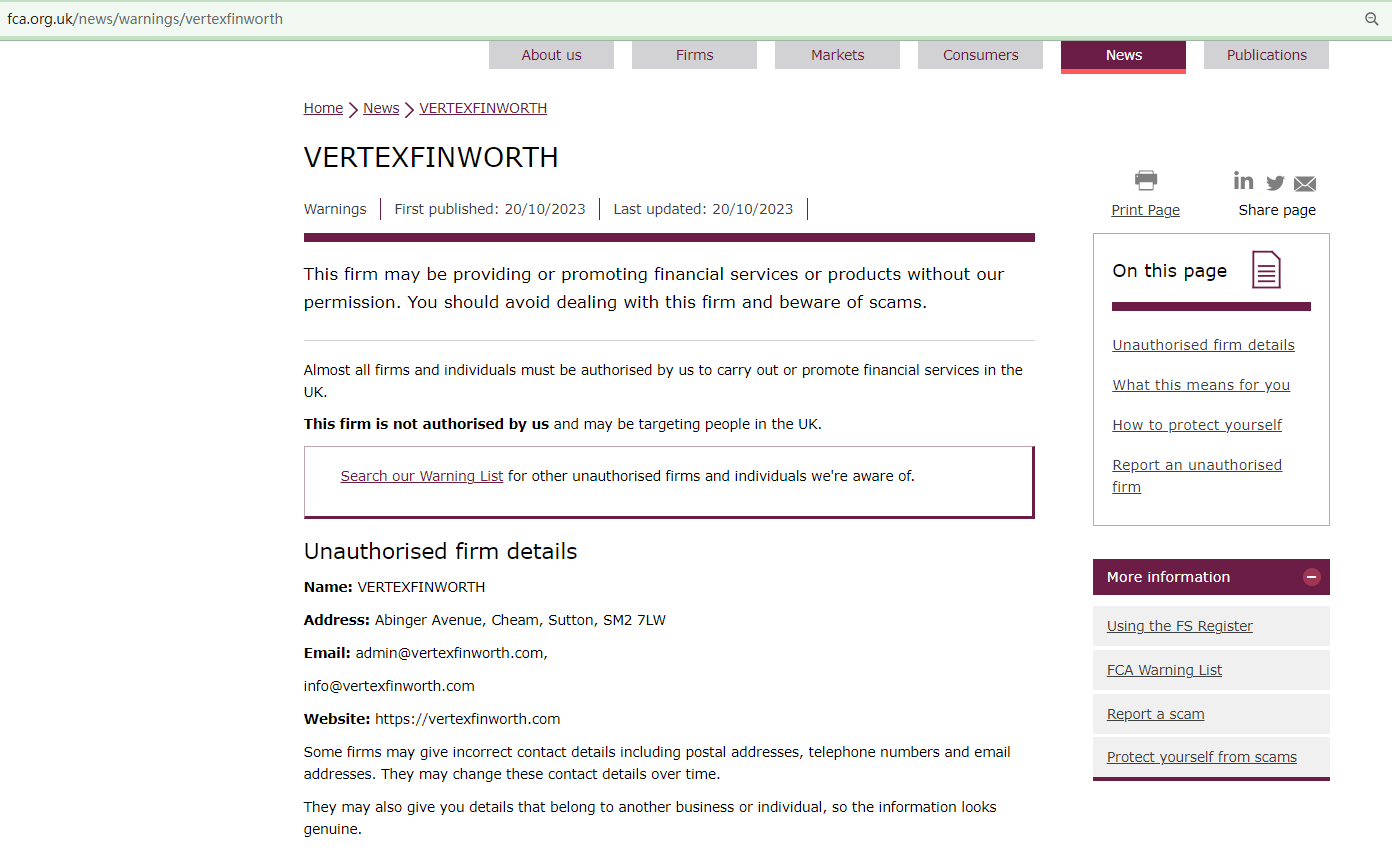 As per UK law, businesses and individuals offering financial services or products in the UK are required to seek authorization from the Financial Conduct Authority (FCA) before they can conduct business. However, the FCA has issued a warning against Vertexfinworth, stating that it is an unauthorized firm in the UK.