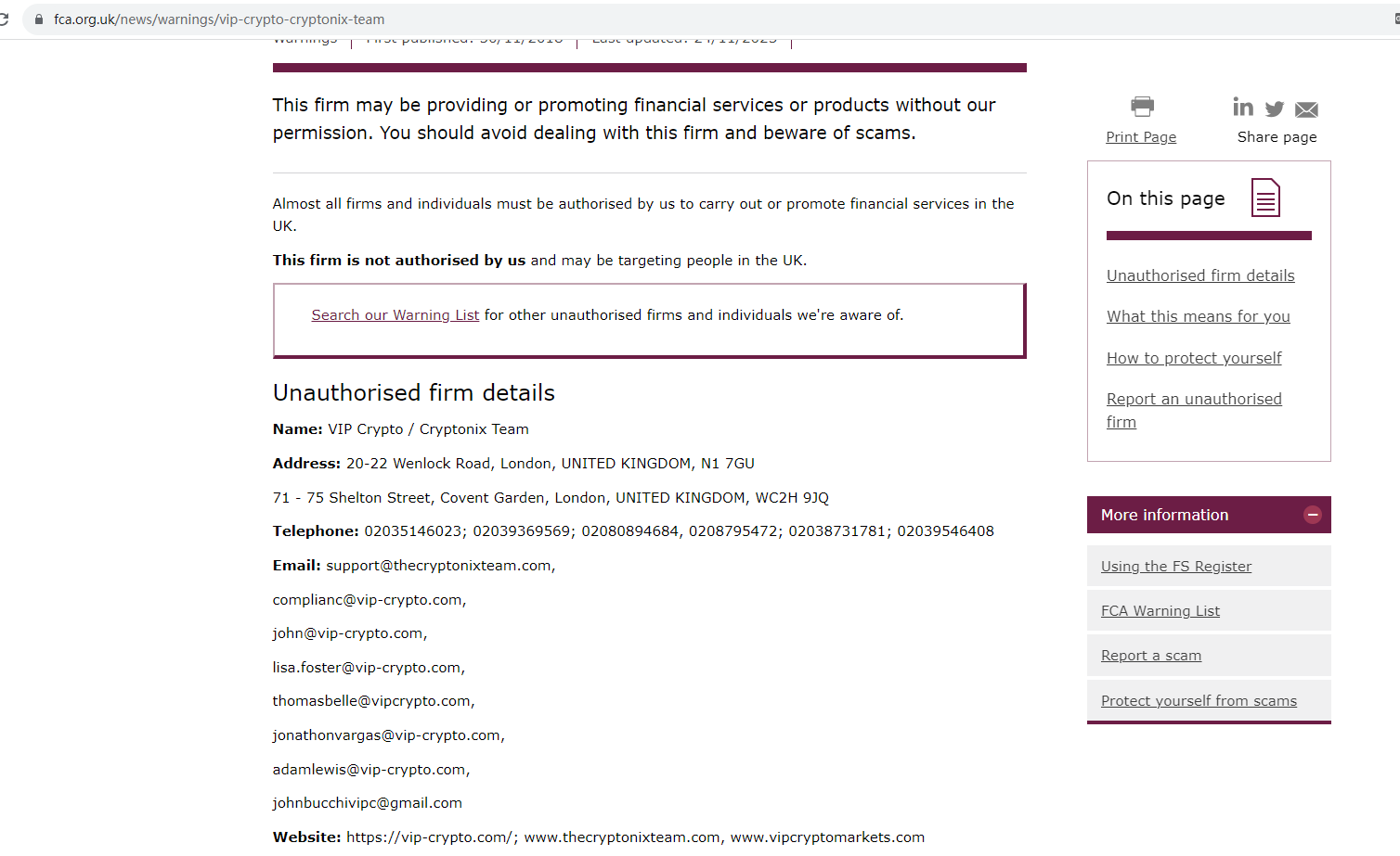 On 24 November 2023, the United Kingdom Financial Conduct Authority (UK FCA) issued a warning that VIP Crypto Markets was providing financial services or products in the UK without authorisation. You may visit: https://www.fca.org.uk/news/warnings/vip-crypto-cryptonix-team