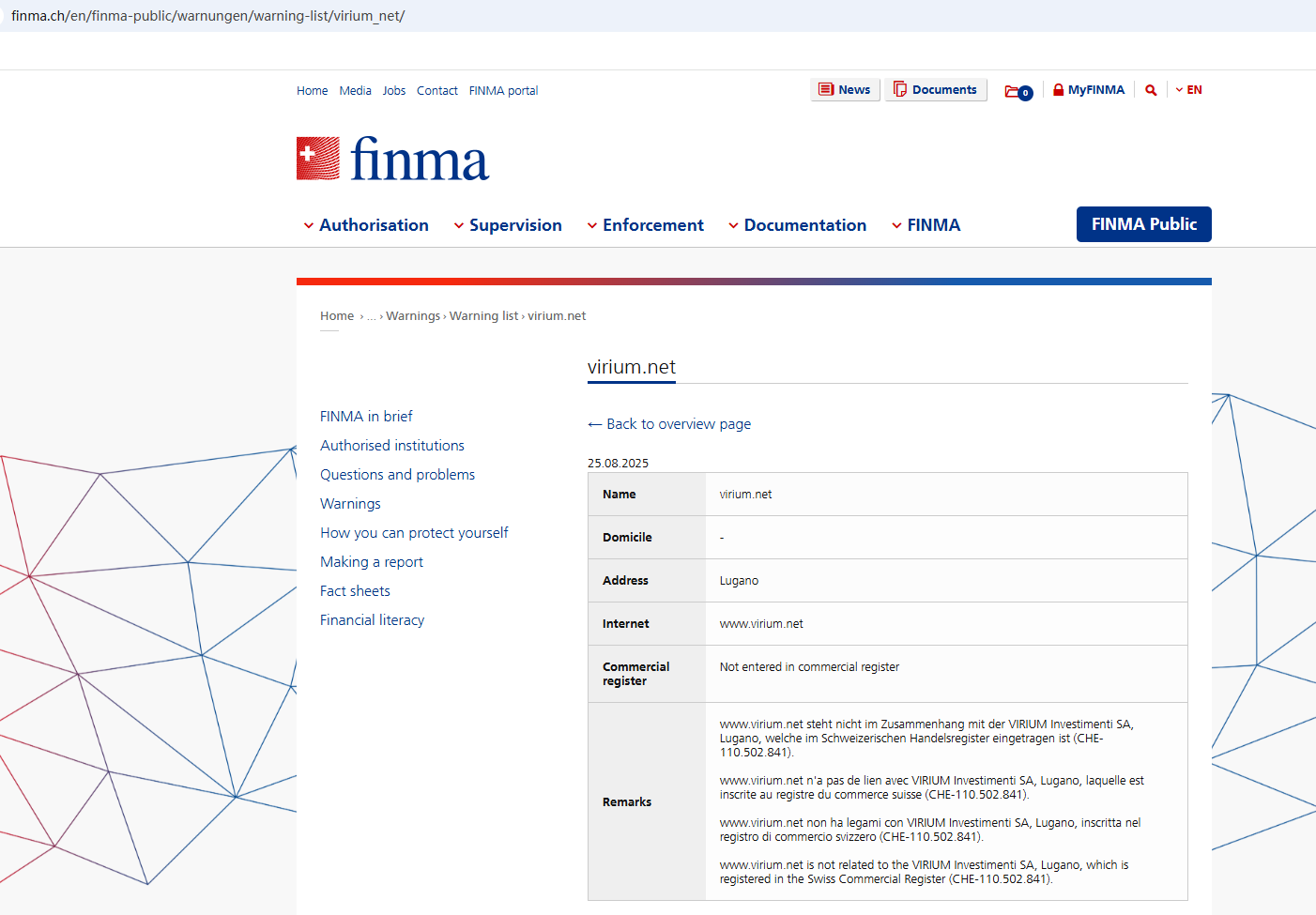 On Aug 25, 2025, the Swiss Financial Market Supervisory Authority (FINMA) issued a warning against Virium, stating that this broker is not entered in its commercial register. https://www.finma.ch/en/finma-public/warnungen/warning-list/virium_net/
