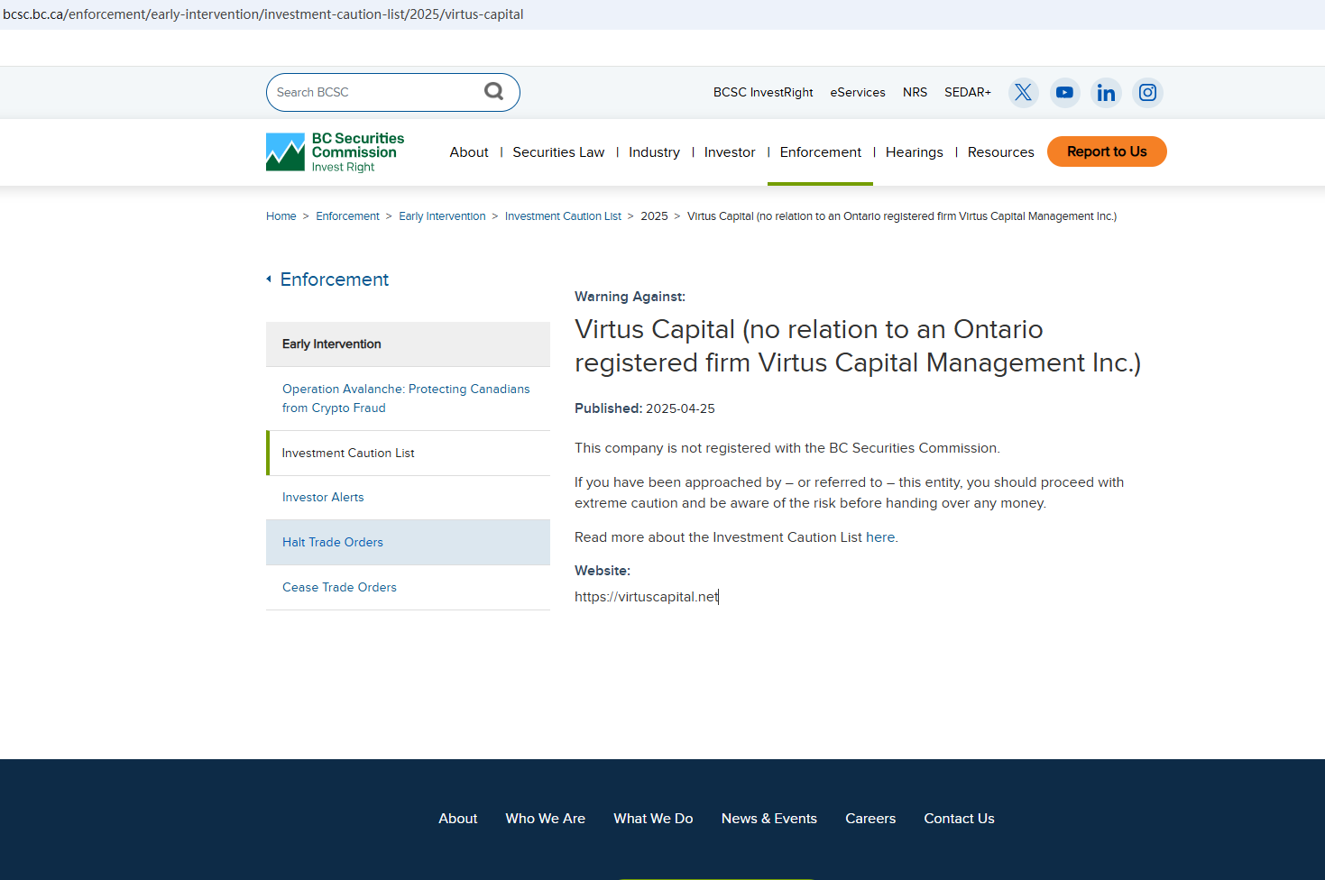 On April 25, 2025, the British Columbia Securities Commission (BCSC) issued a warning that Virtus Capital was providing financial services or products without authorisation. You may visit: https://www.bcsc.bc.ca/enforcement/early-intervention/investment-caution-list/2025/virtus-capital
