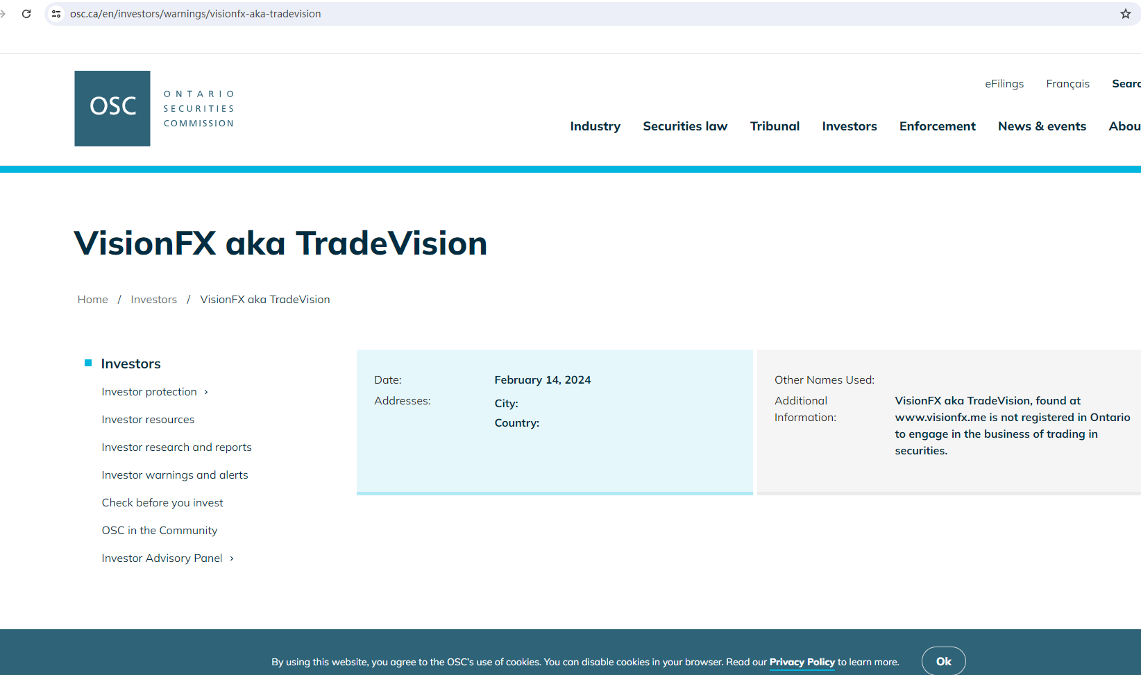 In addition, the Ontario Securities Commission (OSC) issued a warning that VisionFX aka TradeVision was providing financial services or products without authorisation.