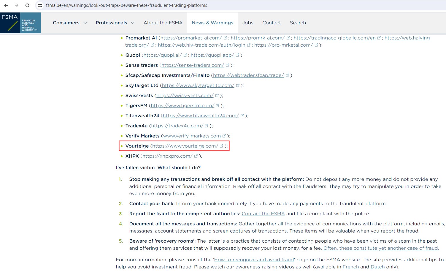 On 16 May 2024, The Financial Services and Markets Authority (FSMA) issued a warning against Vourteige (https://www.vourteige.com), believing this company might be providing financial services or products without authorisation in Belgium. You may visit: https://www.fsma.be/en/warnings/look-out-traps-beware-these-fraudulent-trading-platforms.