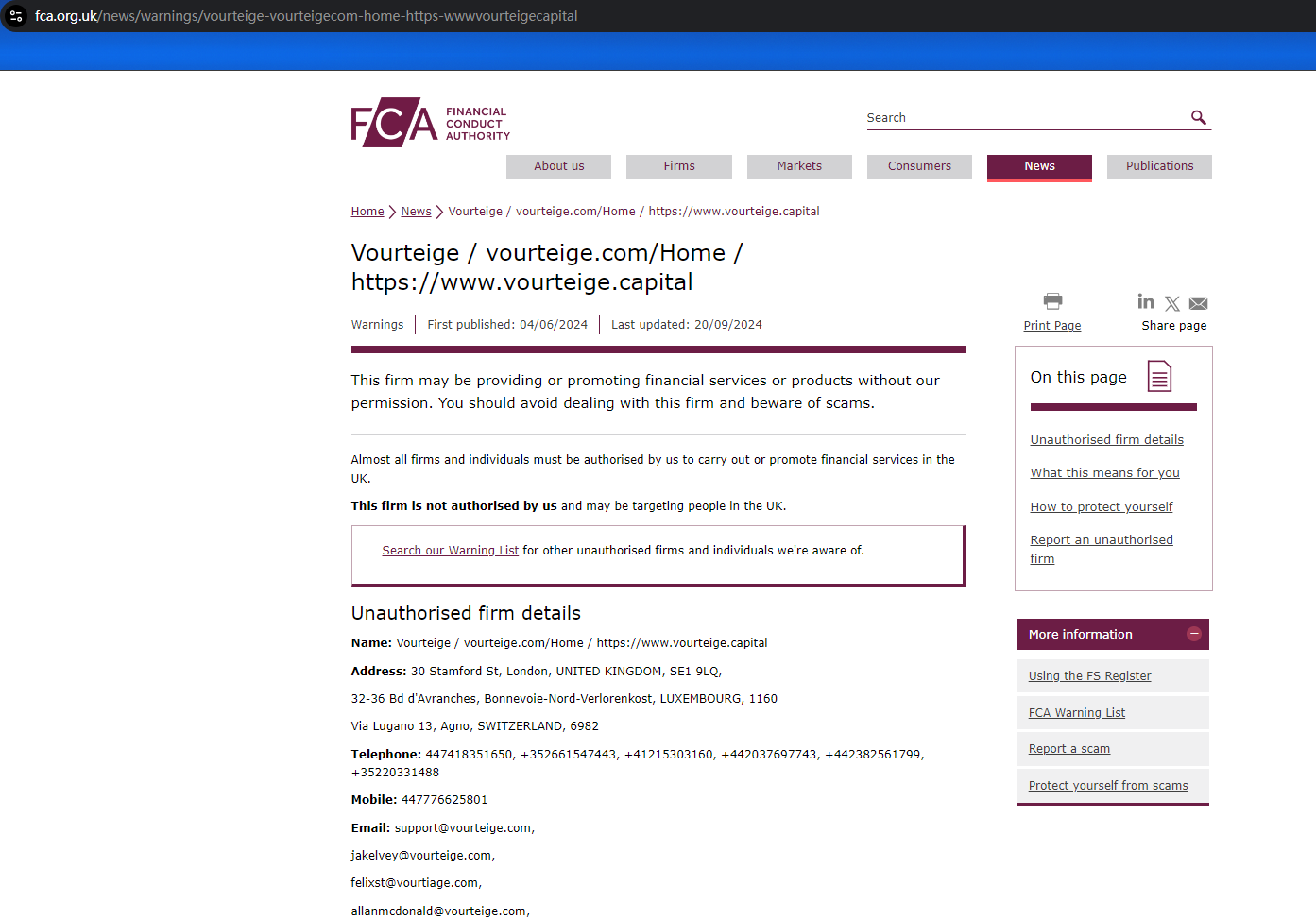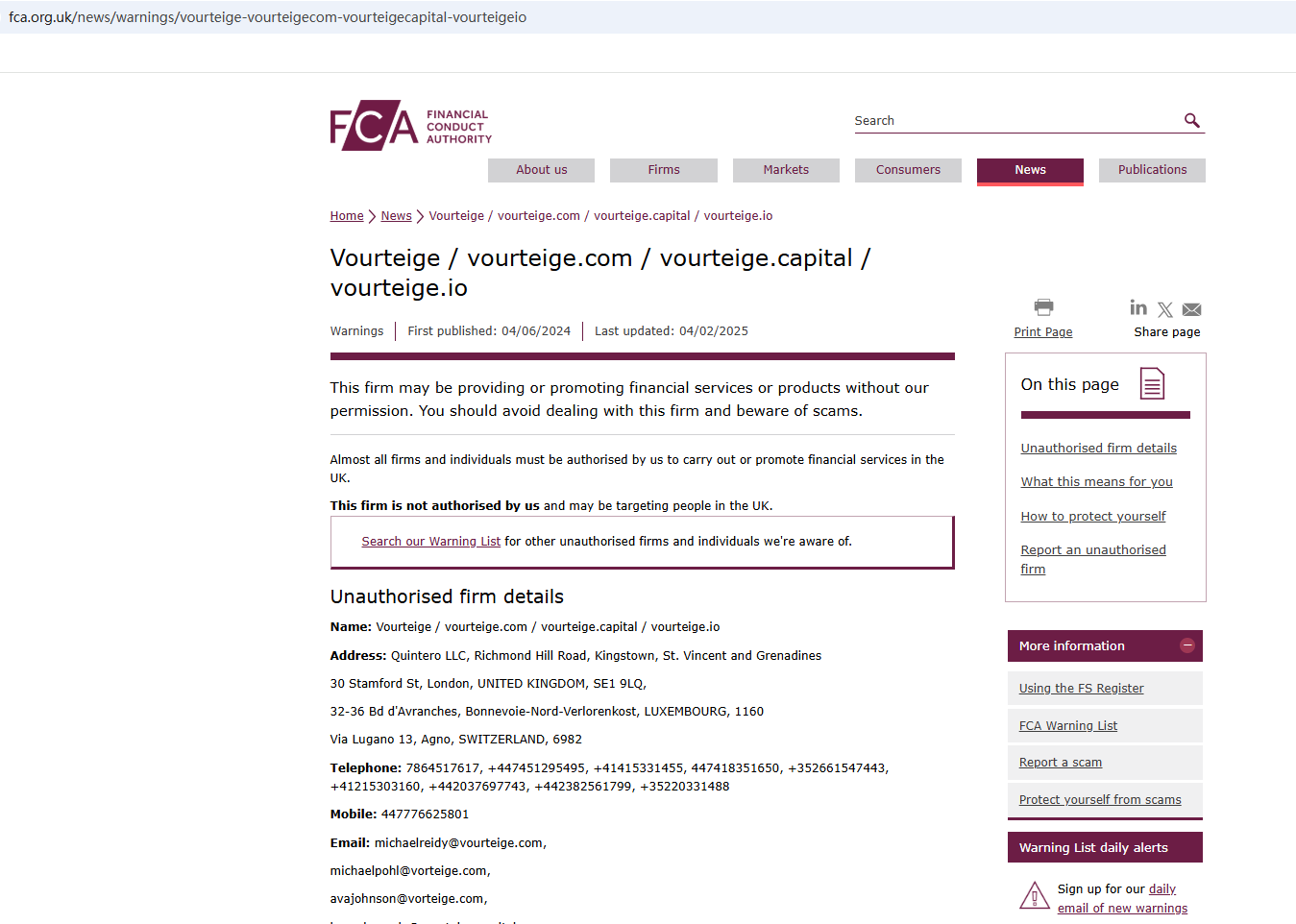 Since Vourteige is still in business to steal money from unsuspecting investors, FCA updates its warning against the platform with more details about the unauthorized firm and cautions the public to stay away from it once again. You may visit: https://www.fca.org.uk/news/warnings/vourteige-vourteigecom-home-https-wwwvourteigecapital