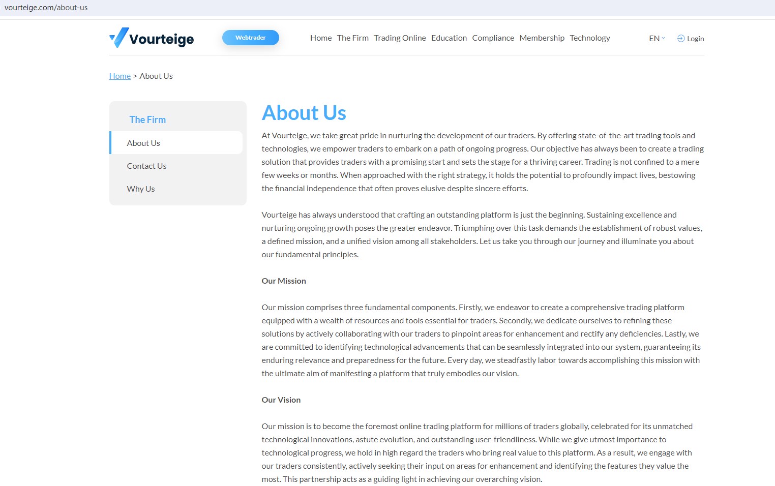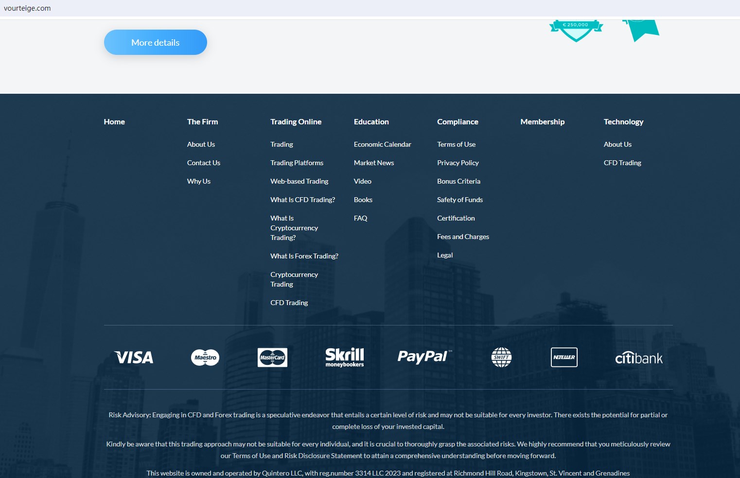 Vourteige claims to be owned and operated by Quintero LLC, and has the registration with the Financial Services Authority in St. Vincent and the Grenadines(SVG FSA), the company registration number: 3314 LLC 2023, offering wide range of financial services, including Forex, Cryptocurrencies, and more instruments in global markets.