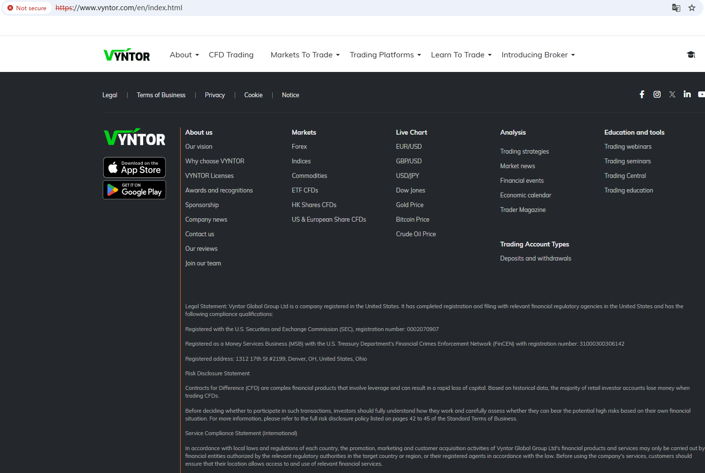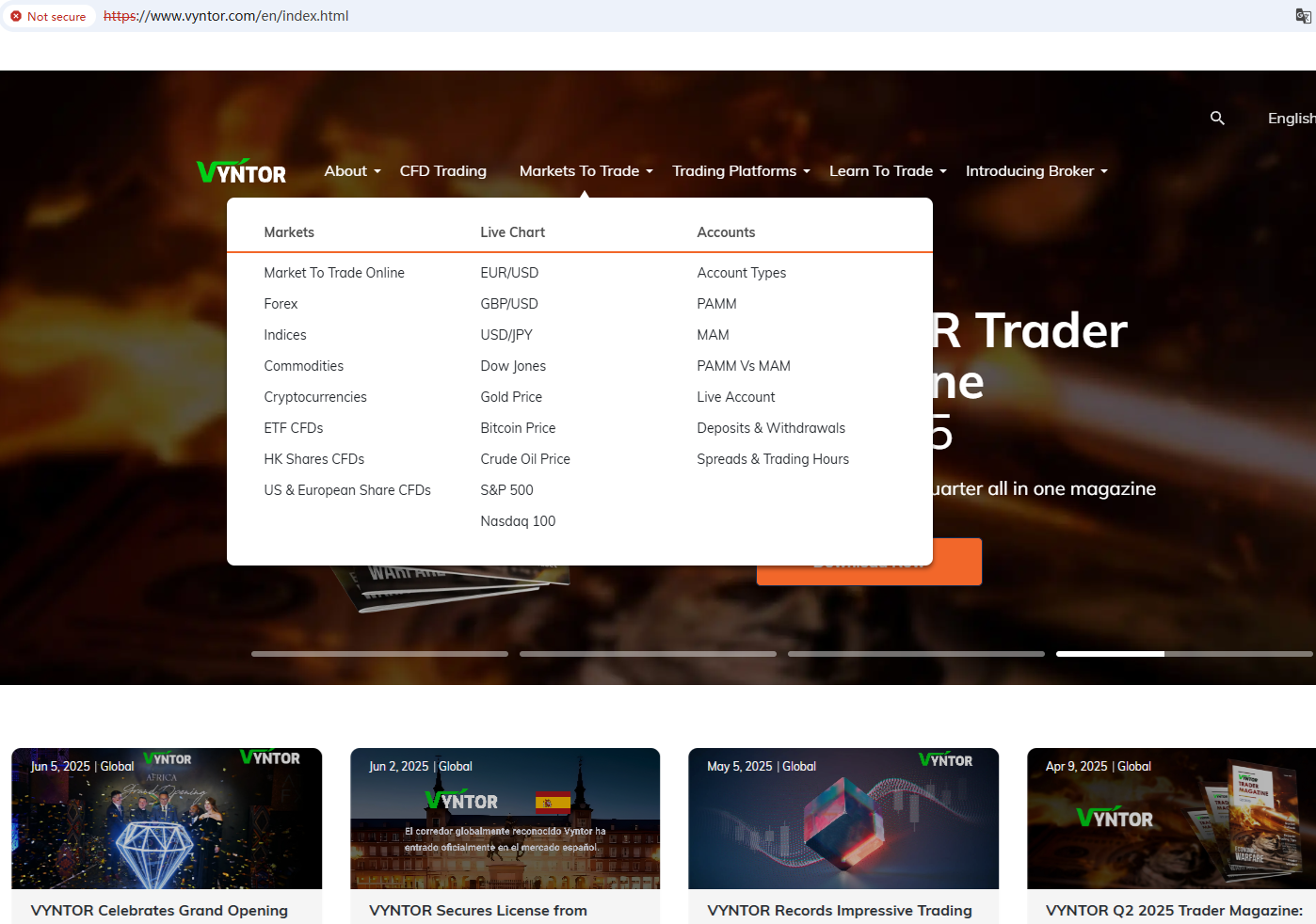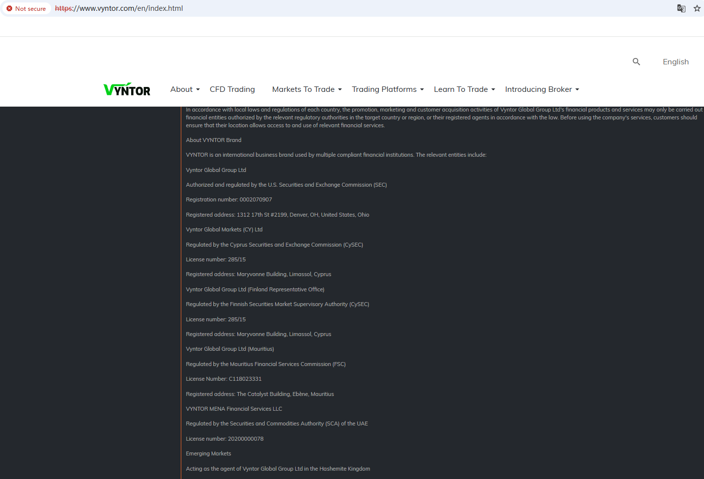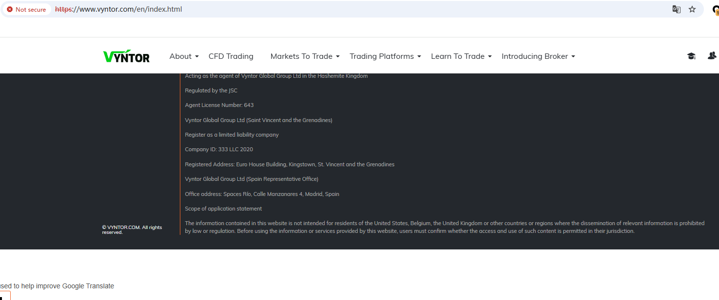 According to its website, it claims to be registered with multiple regulatory bodies. However, a search revealed no matching information with the National Futures Association (NFA), Cyprus Securities and Exchange Commission (CySEC), Financial Services Commission (Mauritius FSC), or Securities and Commodities Authority (SCA). Furthermore, the St. Vincent authorization it mentions does not confer the authority to regulate forex. More notably, the National Securities Market Commission (CNMV) issued a warning against VYNTOR, believing this company might be providing financial services or products without proper authorization.