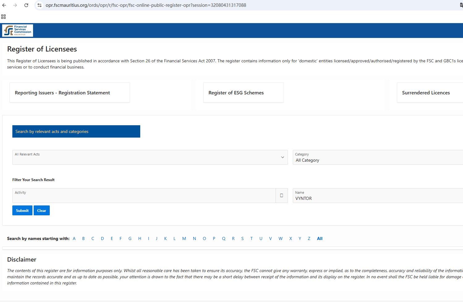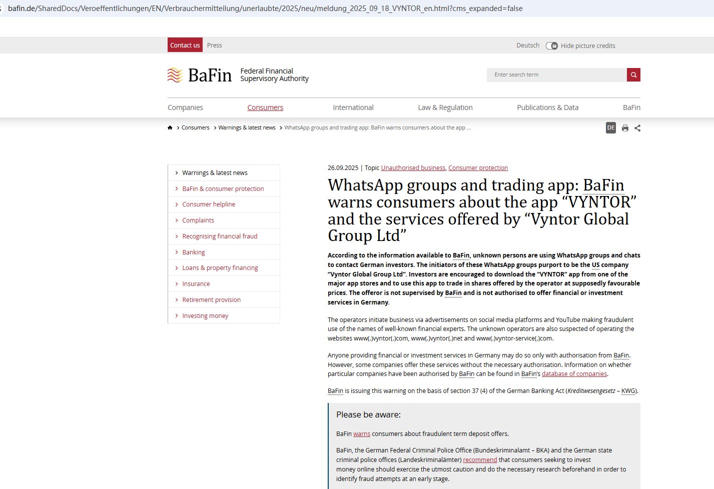 On Sept 26, 2025, the Federal Financial Supervisory Authority (BaFin) issued a warning against VYNTOR for the lack of the required authorization. https://www.bafin.de/SharedDocs/Veroeffentlichungen/EN/Verbrauchermitteilung/unerlaubte/2025/neu/meldung_2025_09_18_VYNTOR_en.html?cms_expanded=false