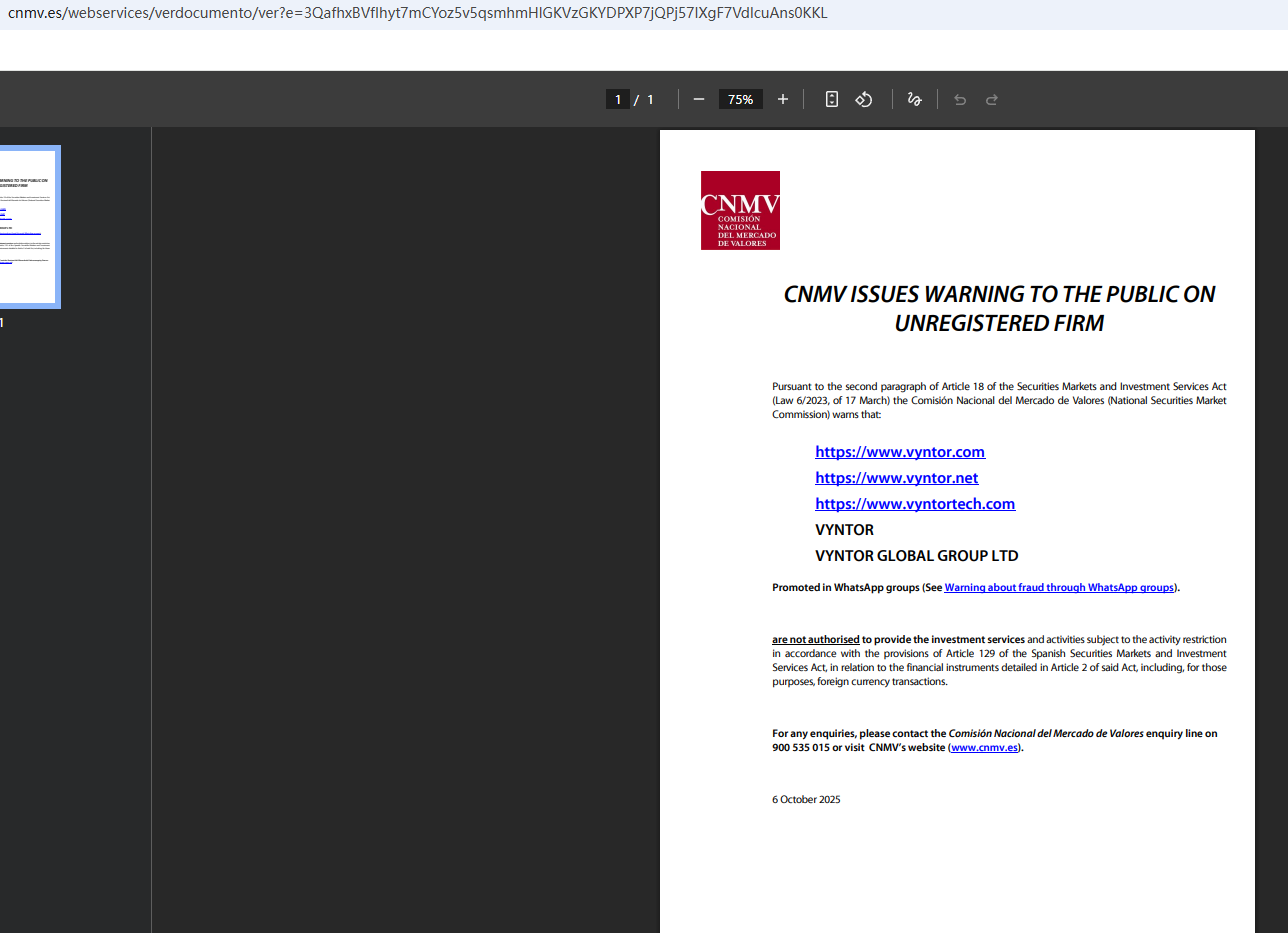 On Oct 6, 2025, the National Securities Market Commission (CNMV) issued a warning against VYNTOR, believing this company might be providing financial services or products without proper authorization. https://www.cnmv.es/webservices/verdocumento/ver?e=3QafhxBVfIhyt7mCYoz5v5qsmhmHlGKVzGKYDPXP7jQPj57IXgF7VdIcuAns0KKL