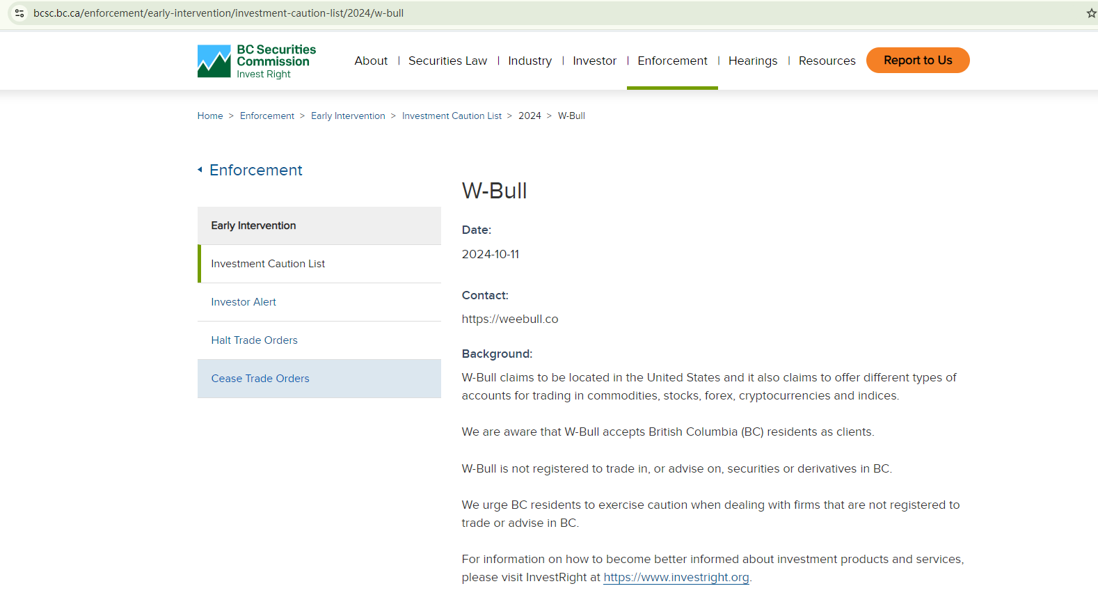 On October 11, 2024, the British Columbia Securities Commission (BCSC) issued a warning against W-Bull, stating that this broker is not registered to trade in, or advise on, securities or derivatives in BC. https://www.bcsc.bc.ca/enforcement/early-intervention/investment-caution-list/2024/w-bull