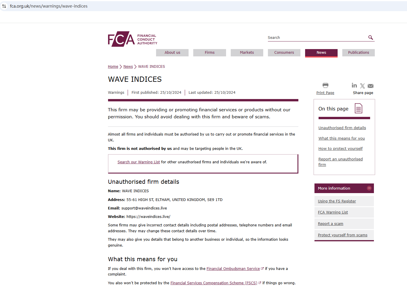 On 25 October 2024, the United Kingdom Financial Conduct Authority (FCA) issued a warning against WAVE INDICES, believing this company might be providing financial services or products without authorisation in the UK. You may visit: https://www.fca.org.uk/news/warnings/wave-indices