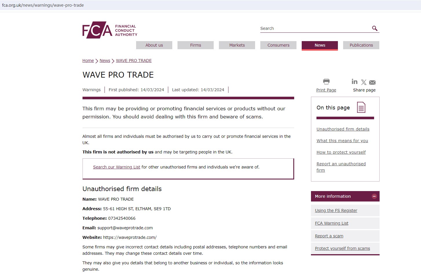And the FCA issued a warning that WAVE PRO TRADE was providing financial services or products in the UK without authorisation.