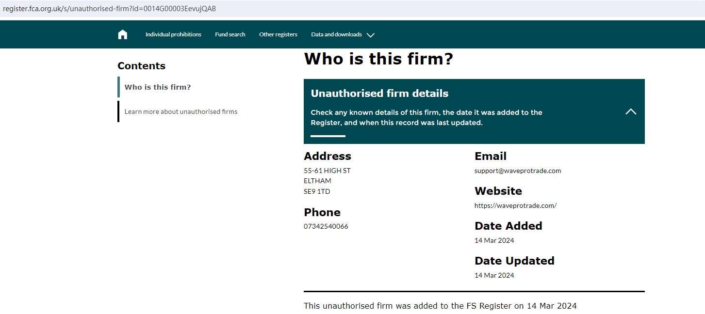 Upon investigation, we found that WAVE PRO TRADE is not Authorized by the United Kingdom Financial Conduct Authority (FCA).