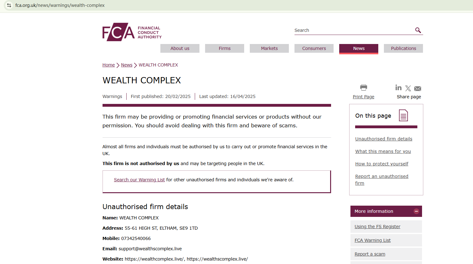 On April 16, 2025, the Financial Conduct Authority (FCA) issued a warning against WEALTH COMPLEX, believing this company might be providing financial services or products without proper authorization in the UK. https://www.fca.org.uk/news/warnings/wealth-complex