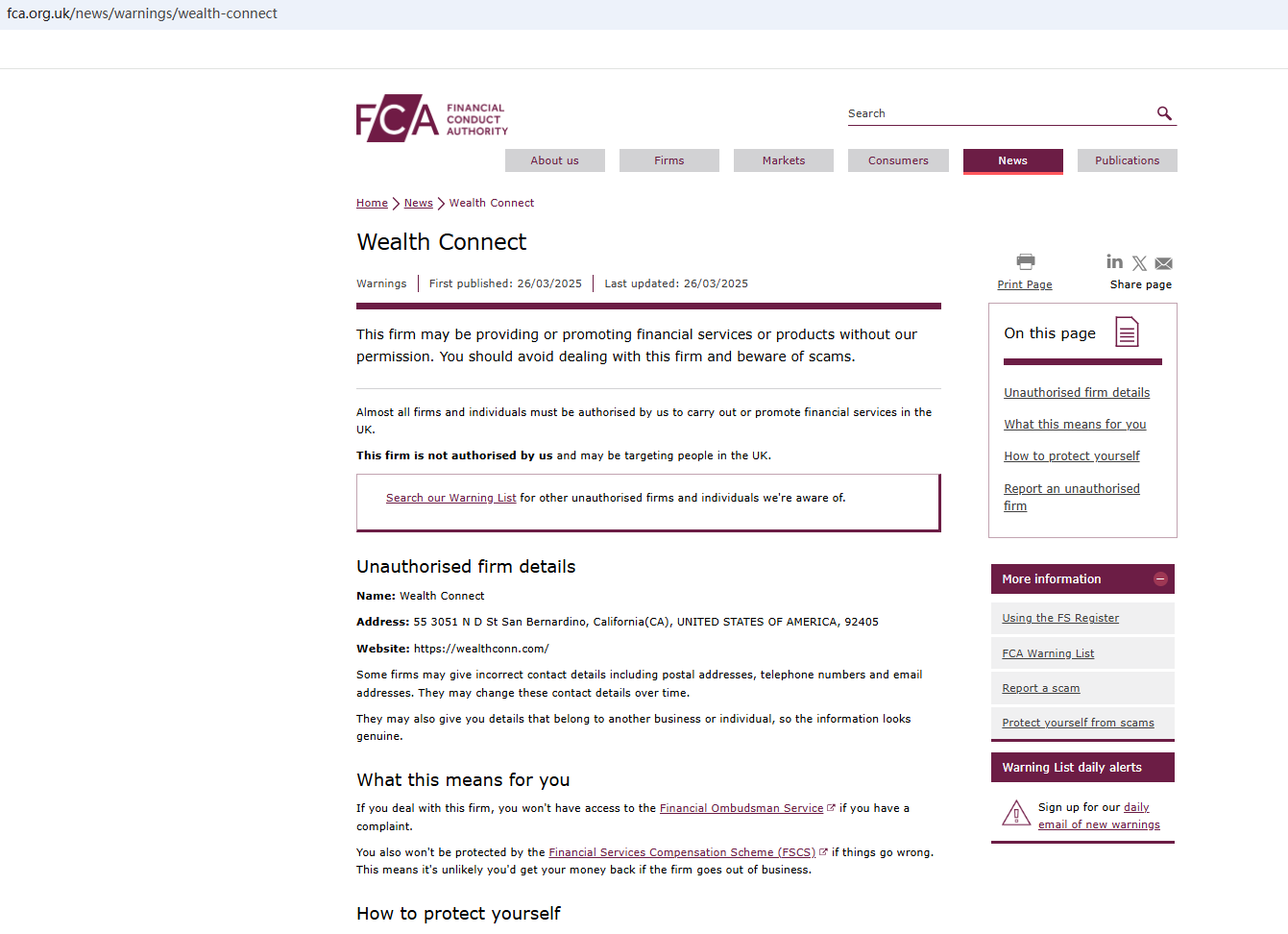 On March 26, 2025, the Financial Conduct Authority (FCA) issued a warning against Wealth Connect for the lack of the required authorization. https://www.fca.org.uk/news/warnings/wealth-connect