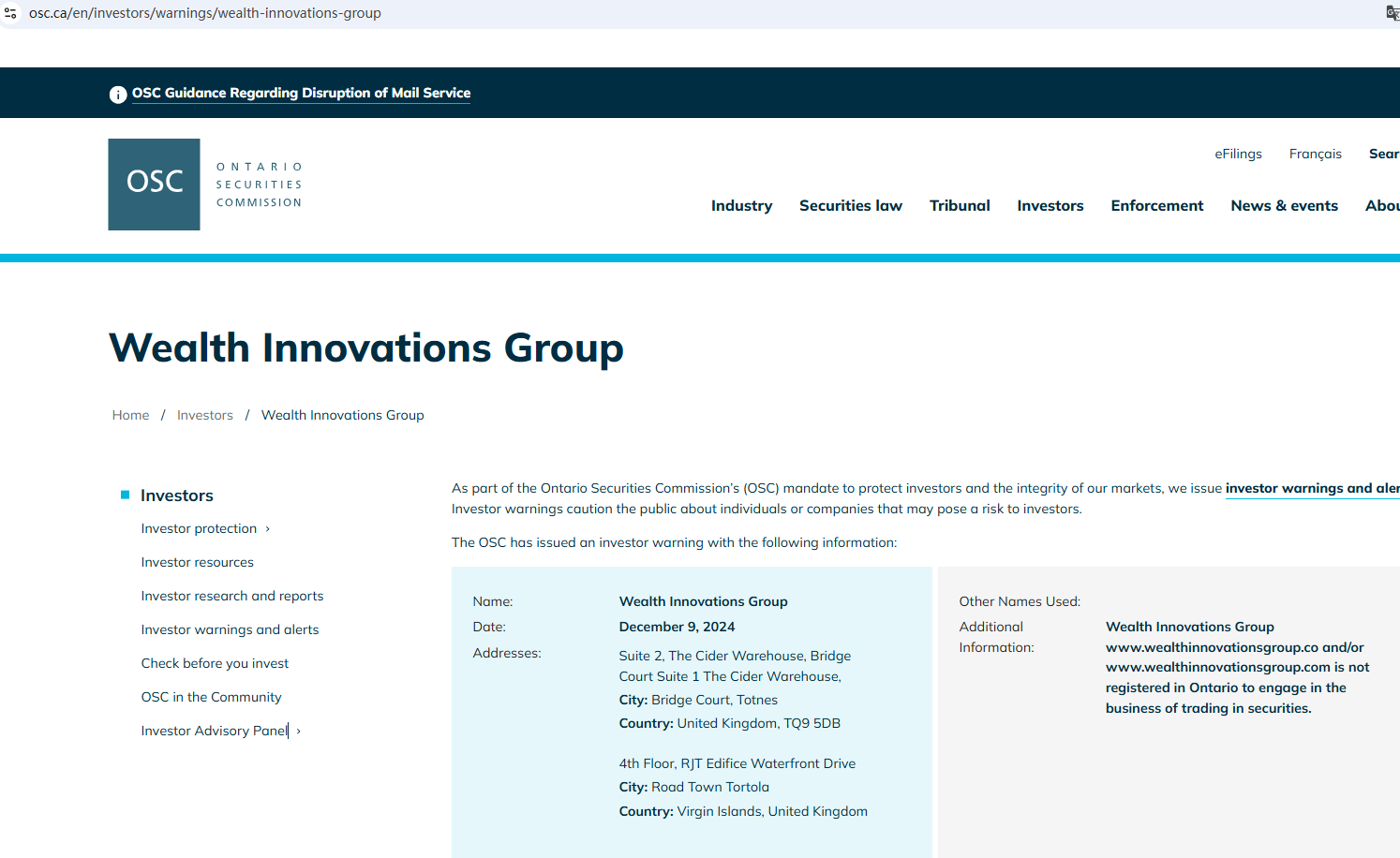 On 9 December 2024, the Ontario Securities Commission (OSC) issued a warning that Wealth Innovations Group was providing financial services or products without authorization. You may visit: https://www.osc.ca/en/investors/warnings/wealth-innovations-group