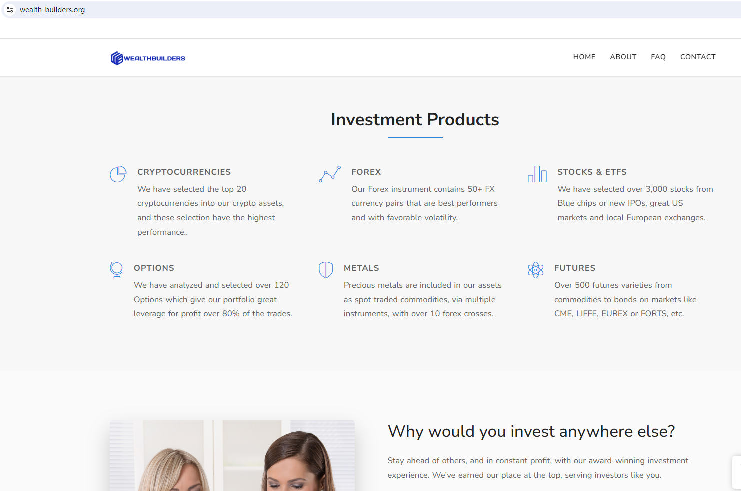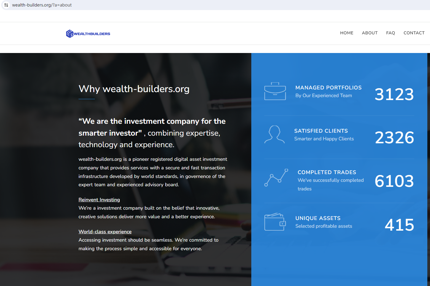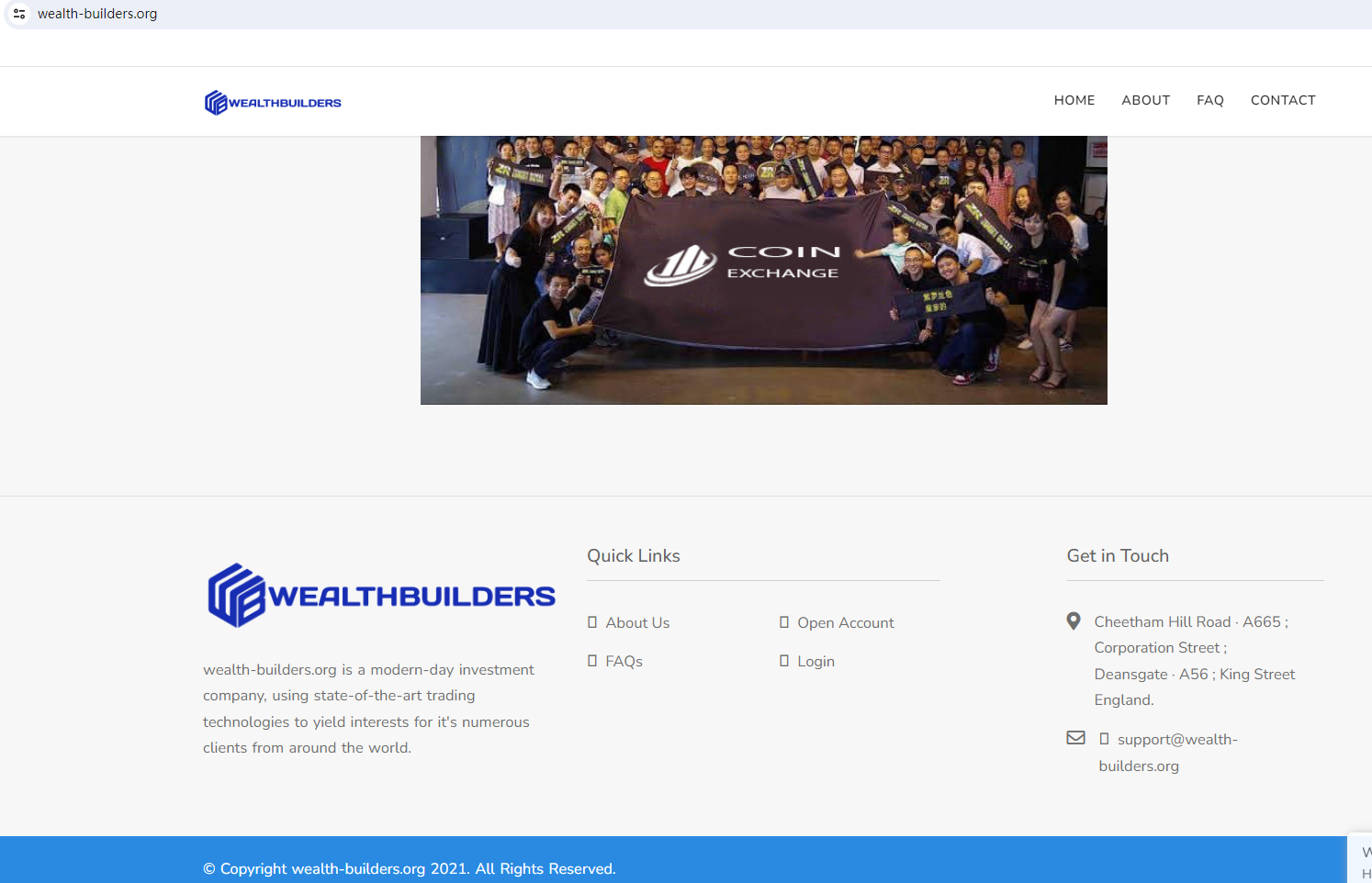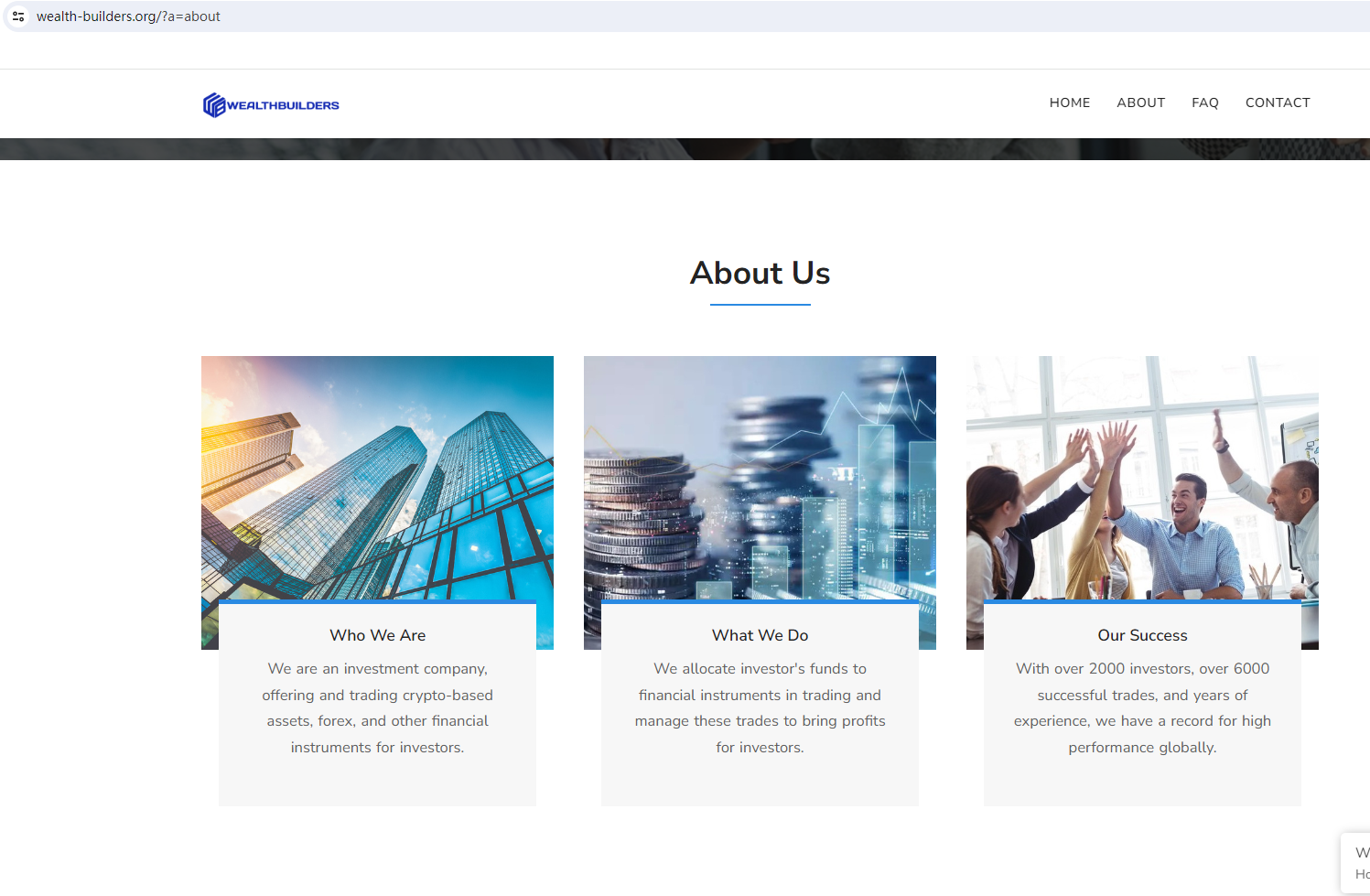 According to its website, it is located in England. Upon investigation, we found that the Financial Conduct Authority (FCA) issued a warning against WEALTHBUILDERS, believing this company might be providing financial services or products without proper authorization in the UK. In addition, it is worth noting that WEALTHBUILDERS is among the scammers using website templates commonly associated with fraudulent activities. It utilizes the same website template as HIGH GAINS INVESTMENT (https://www.brokersview.com/brokers/high-gains-investment-(aka-highgains.online)), a scam previously exposed by BrokersView. Scam websites often exhibit certain common traits. They typically have short lifespans, disappearing as soon as their fraudulent activities are discouvered, only to reappear under a different brand and web address. These sites are frequently hastily assembled, with fraudsters commonly utilizing basic forex broker website templates to facilitate their scams. They simply replace the existing brand name in the content with their own, often neglecting to ensure grammatical accuracy or logical consistency.