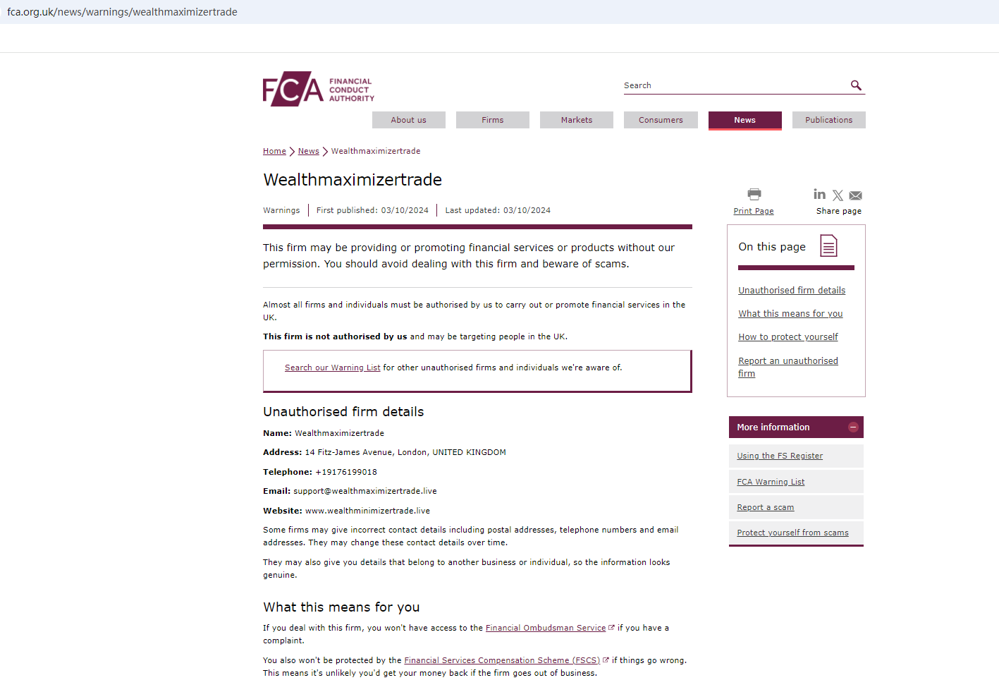 What's more, the United Kingdom Financial Conduct Authority (FCA) issued a warning against Wealthmaximizertrade, believing this company might be providing financial services or products without authorisation in the UK.