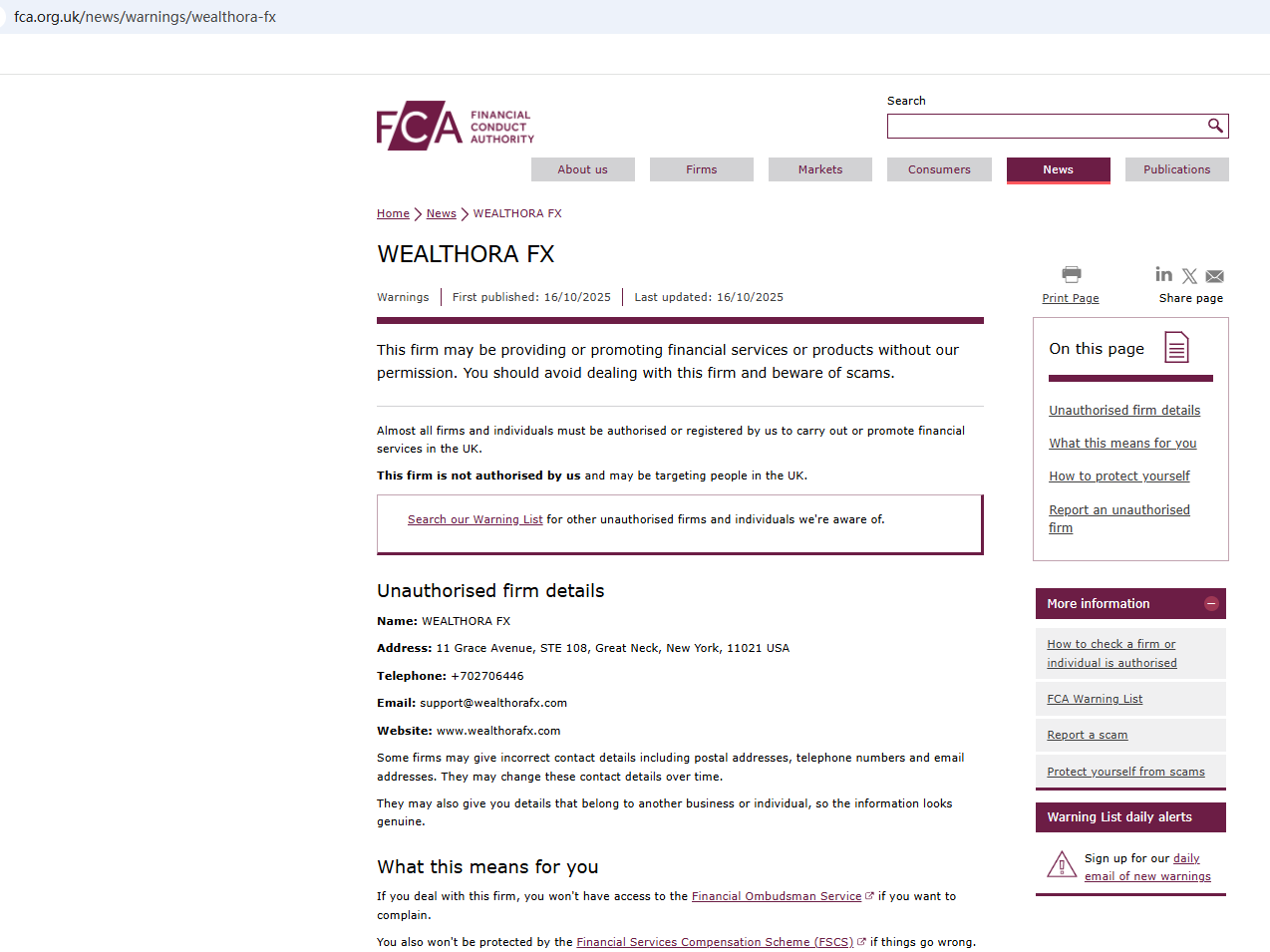 On Oct 16, 2025, the Financial Conduct Authority (FCA) issued a warning regarding WEALTHORA FX, suspecting that this company may be offering financial services or products without the necessary authorization. https://www.fca.org.uk/news/warnings/wealthora-fx