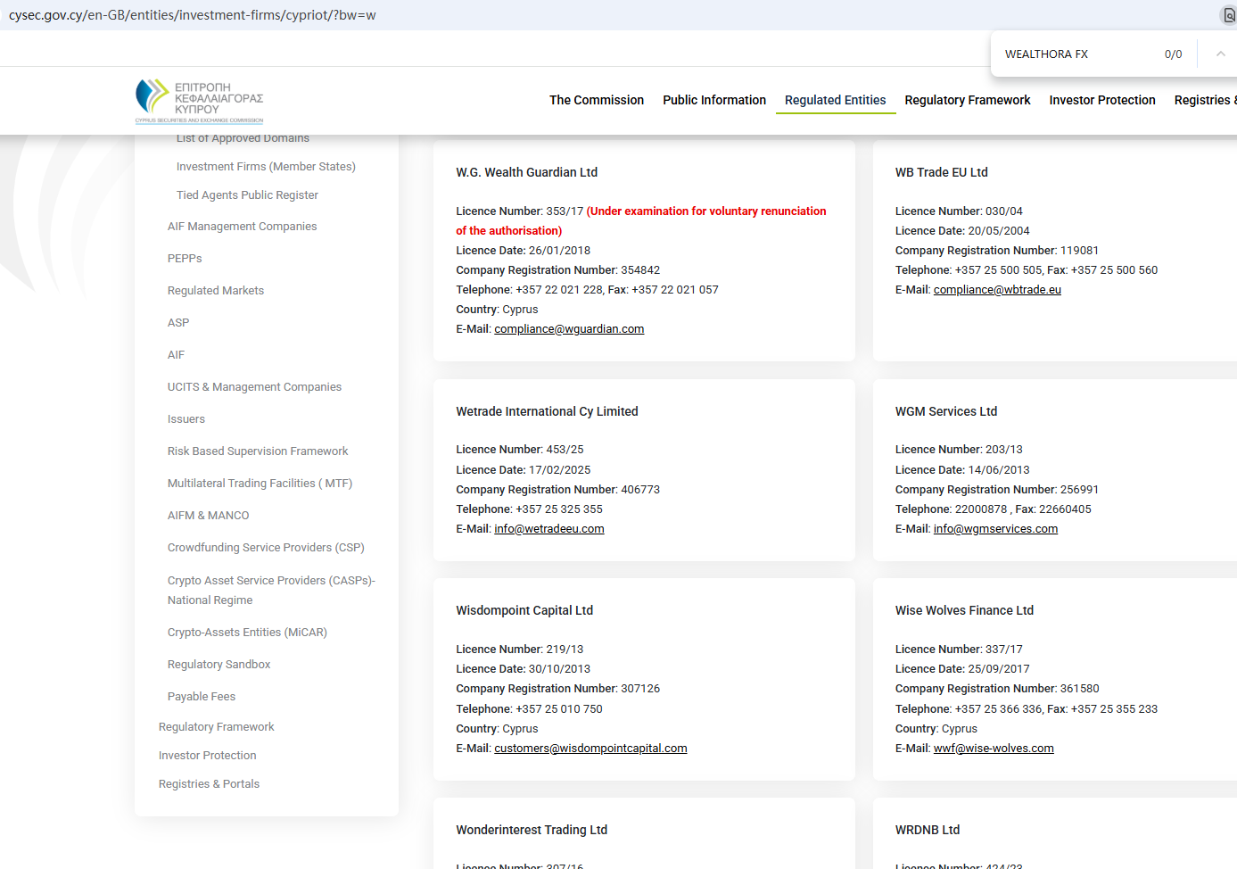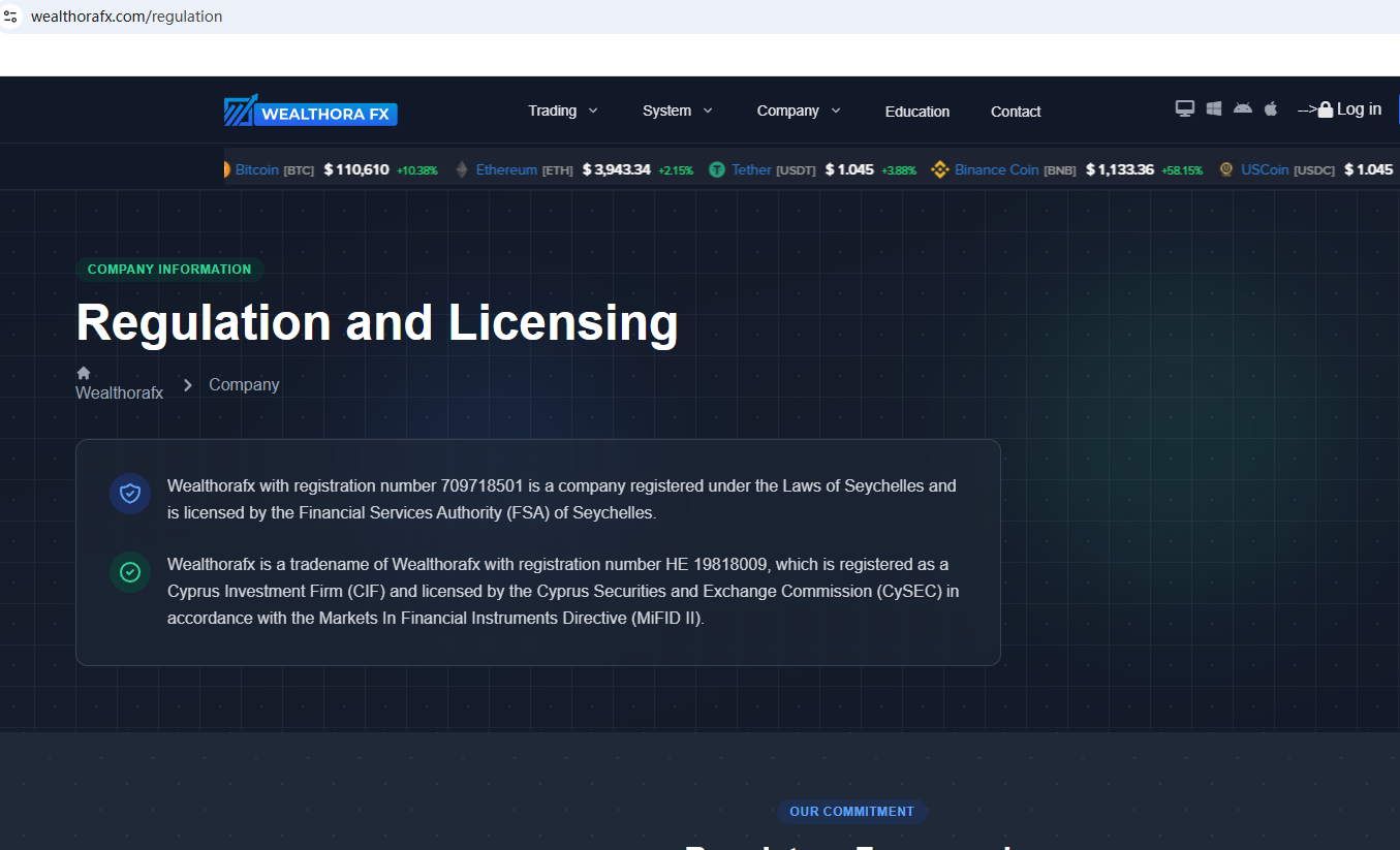 According to its website, it claims to be regulated by the Seychelles Financial Services Authority (Seychelles FSA) and the Cyprus Securities and Exchange Commission (CySEC). Upon investigation, no matching information was found in the Seychelles FSA and CySEC. In addition, the Financial Conduct Authority (FCA) issued a warning regarding WEALTHORA FX, suspecting that this company may be offering financial services or products without the necessary authorization.