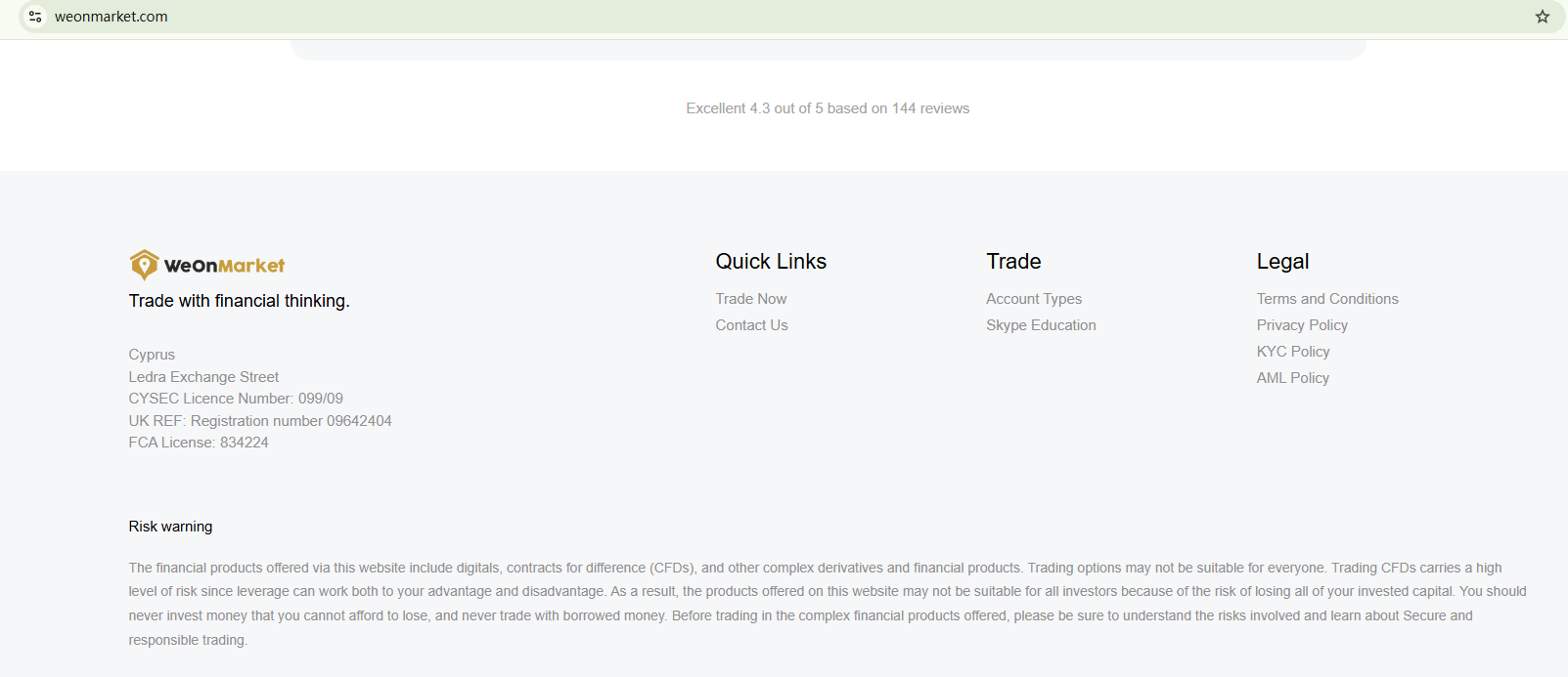 The website of WeOnMarket seems to be quite new, with its domain registered in Feb 2024. While it claims to be regulated in the UK, allegedly holding an FRN 834224, our research indicates that the FRN is associated with a genuine firm which has nothing to do with WeOnMarket. This is crook. As for its purportion of being licensed by the Cyprus Securities and Exchange Commission (CySEC), it has been denied by the financial authority in a warning having blacklisted WeOnMarket.