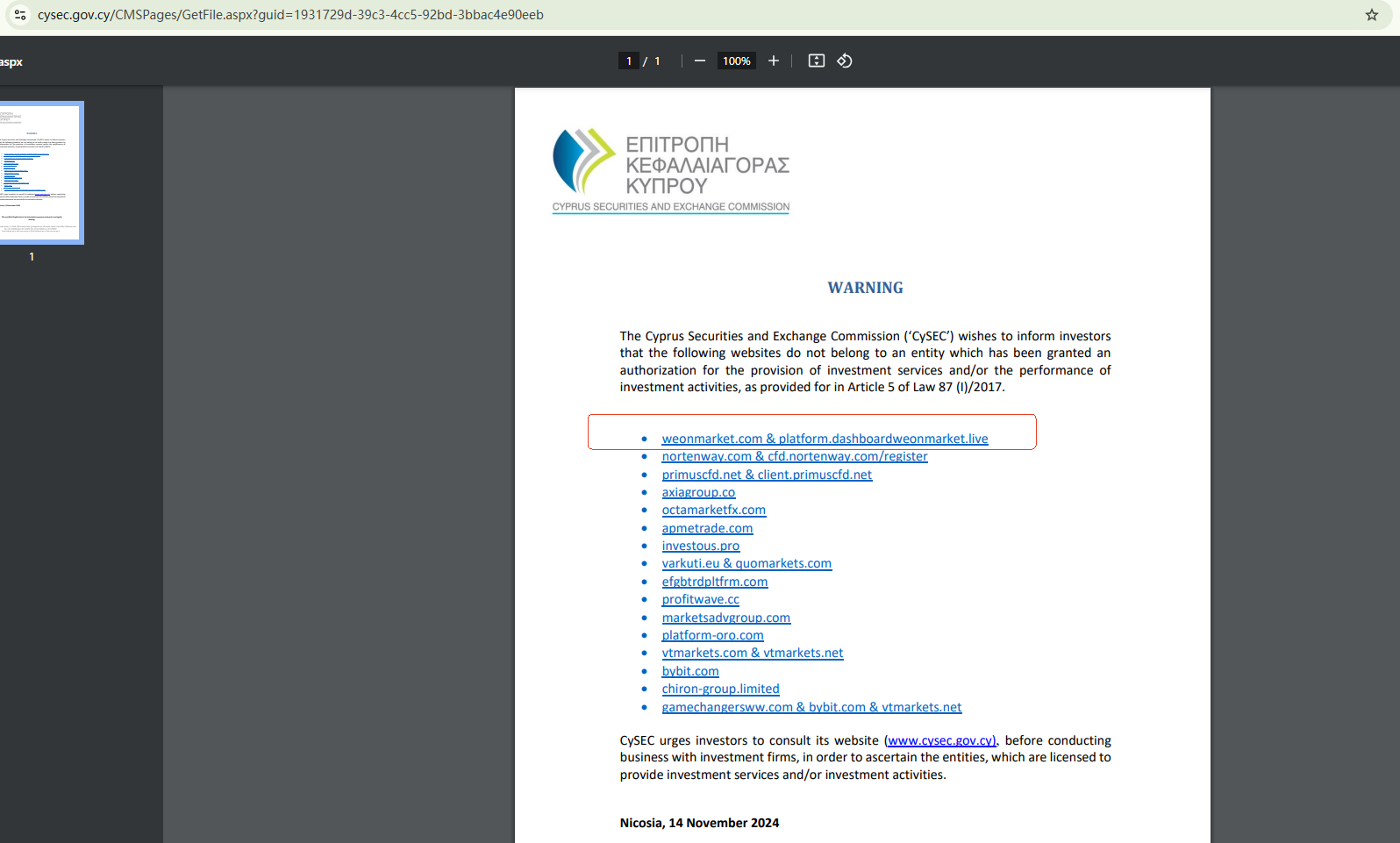 On November 14, 2024, the Cyprus Securities and Exchange Commission (CySEC) added WeOnMarket to its warning list, stating it does not belong to an entity which has been granted an authorization for the provision of investment services and/or the performance of investment activities. https://www.cysec.gov.cy/CMSPages/GetFile.aspx?guid=1931729d-39c3-4cc5-92bd-3bbac4e90eeb