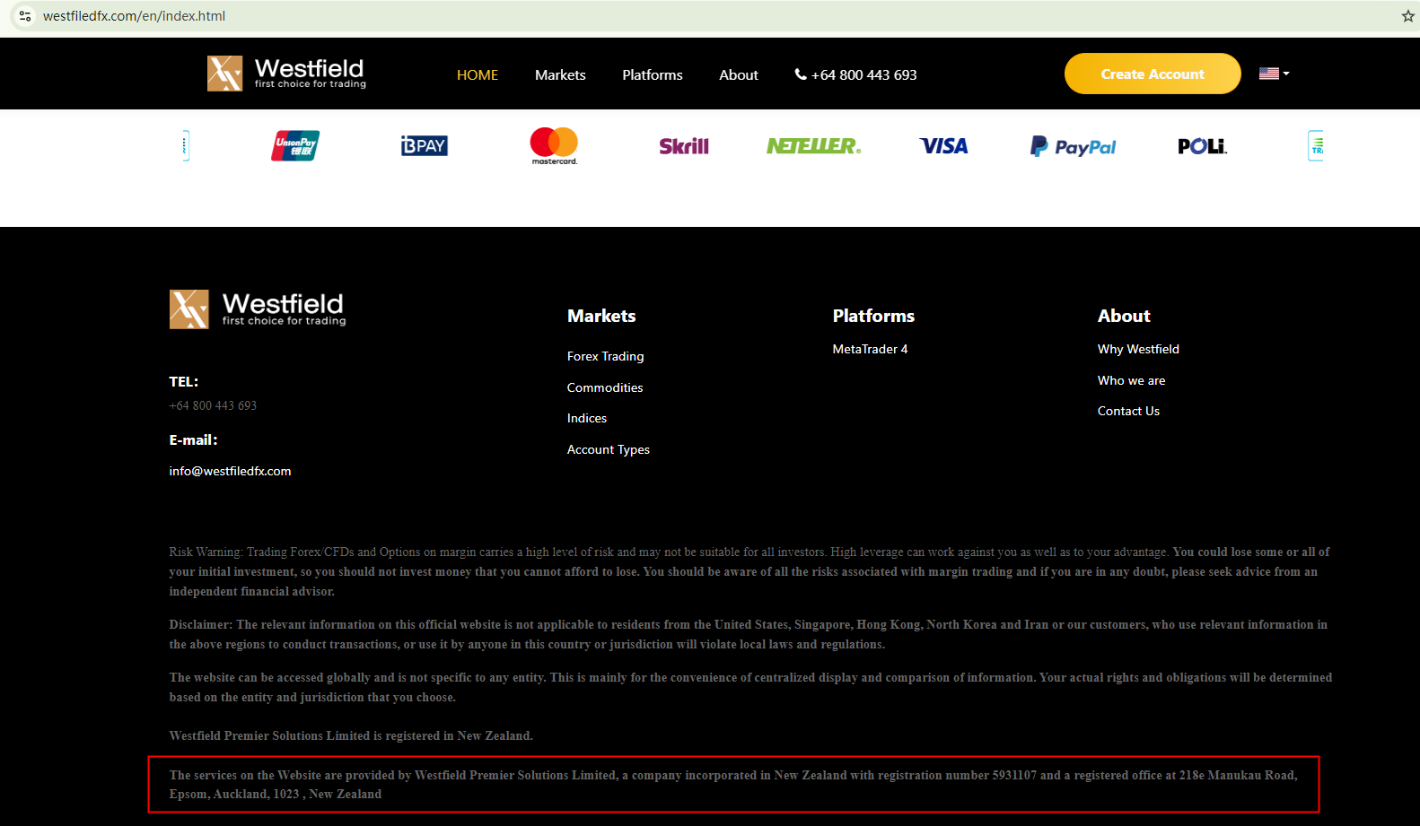 The site Westfiledfx.com claims that the company behind it is Westfield Premier Solutions Limited, a company registered in New Zealand. However, the Financial Markets Authority (NZ FMA) has issued a warning about the matter, identifying Westfiledfx.com as an imposter website and noting that the said registered firm has no association with the site.
